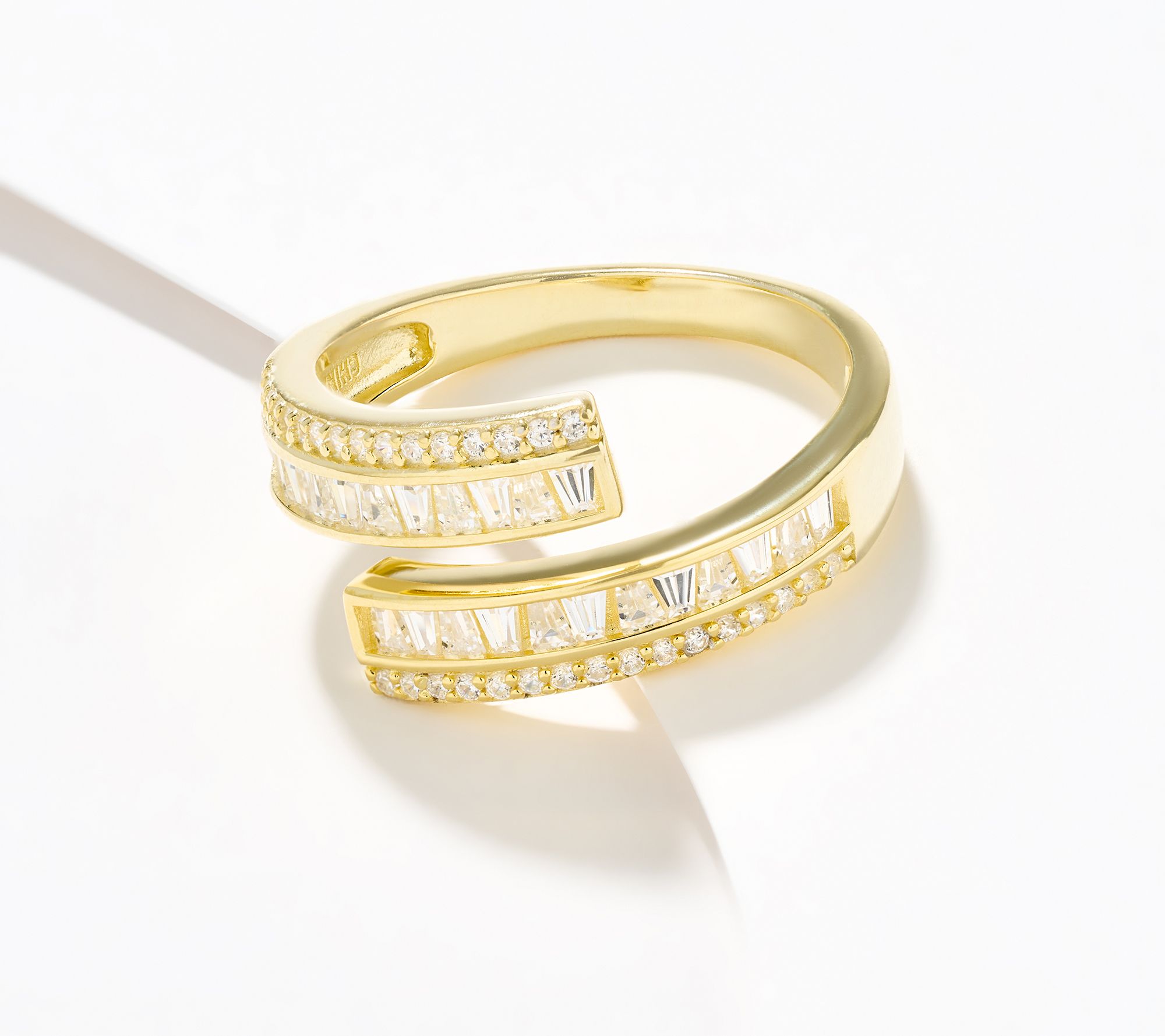 • Bypass design; tapered baguette-cut and round Diamonique simulated diamonds