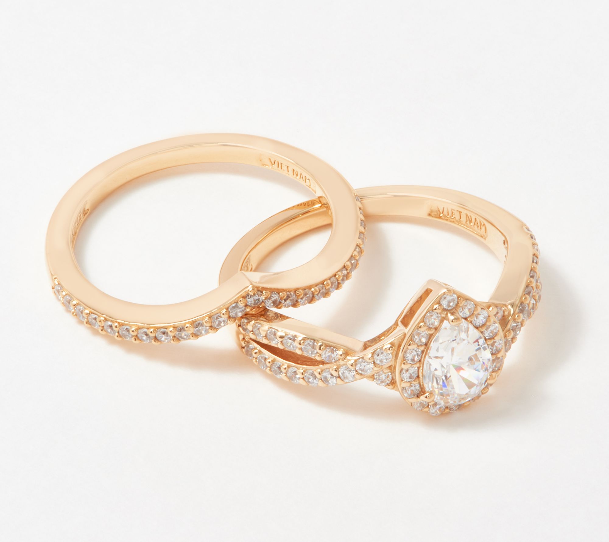 • Includes solitaire halo ring and pointed band ring