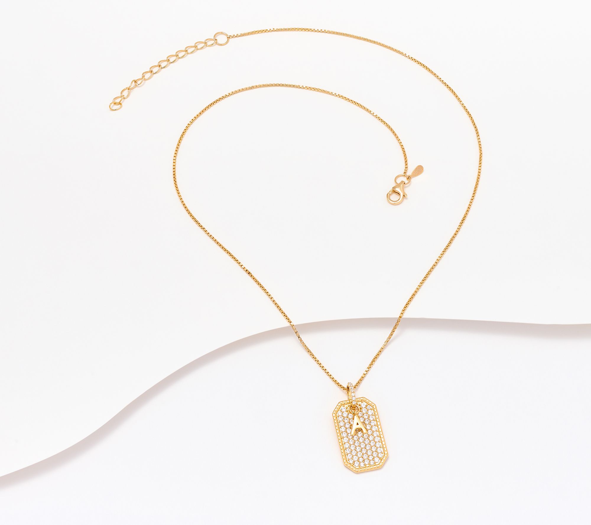 Maybe you won't see your name in lights up on a marquee any time soon, but how about your initial? Feel famous wearing this dog tag necklace -- the flat rectangular pendant provides the perfect surface for a personalized initial and a dazzling design of Diamonique simulated diamonds.