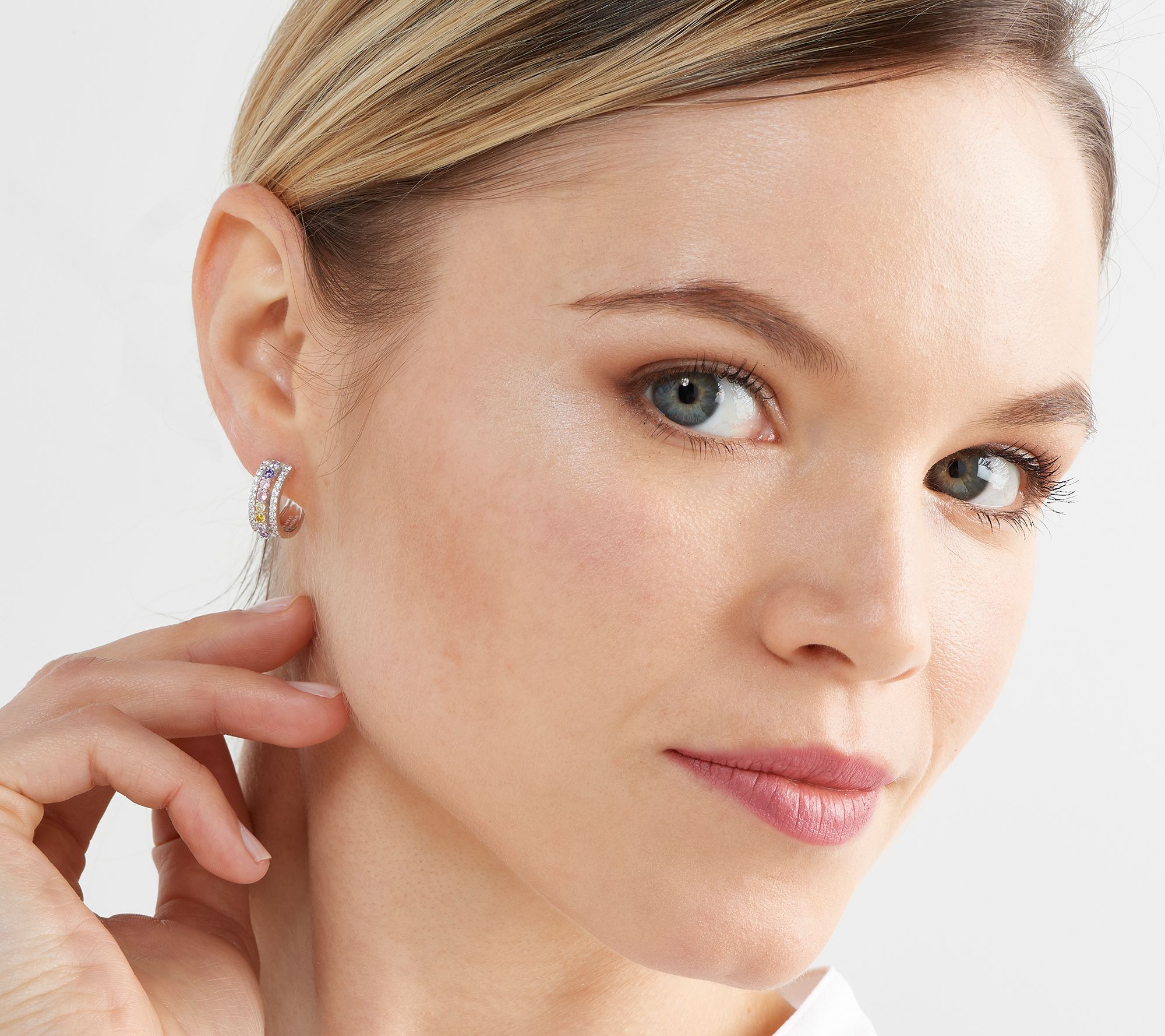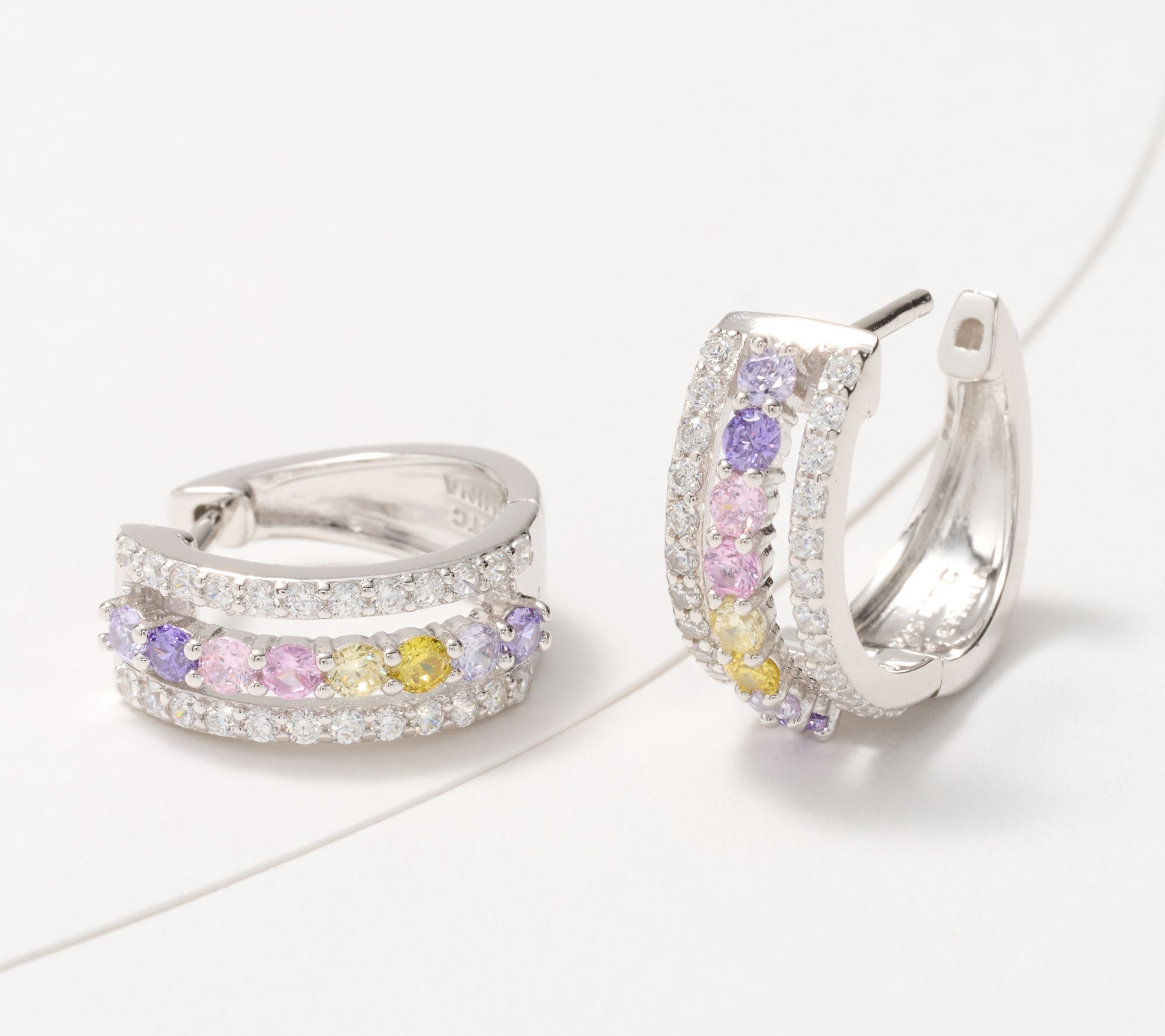 Cubic zirconia Diamonique simulated diamonds in lovely shades of pink, purple, yellow, and green give these huggie hoops their undeniable appeal. White cubic zirconia Diamonique simulated diamonds complete the sparkle.