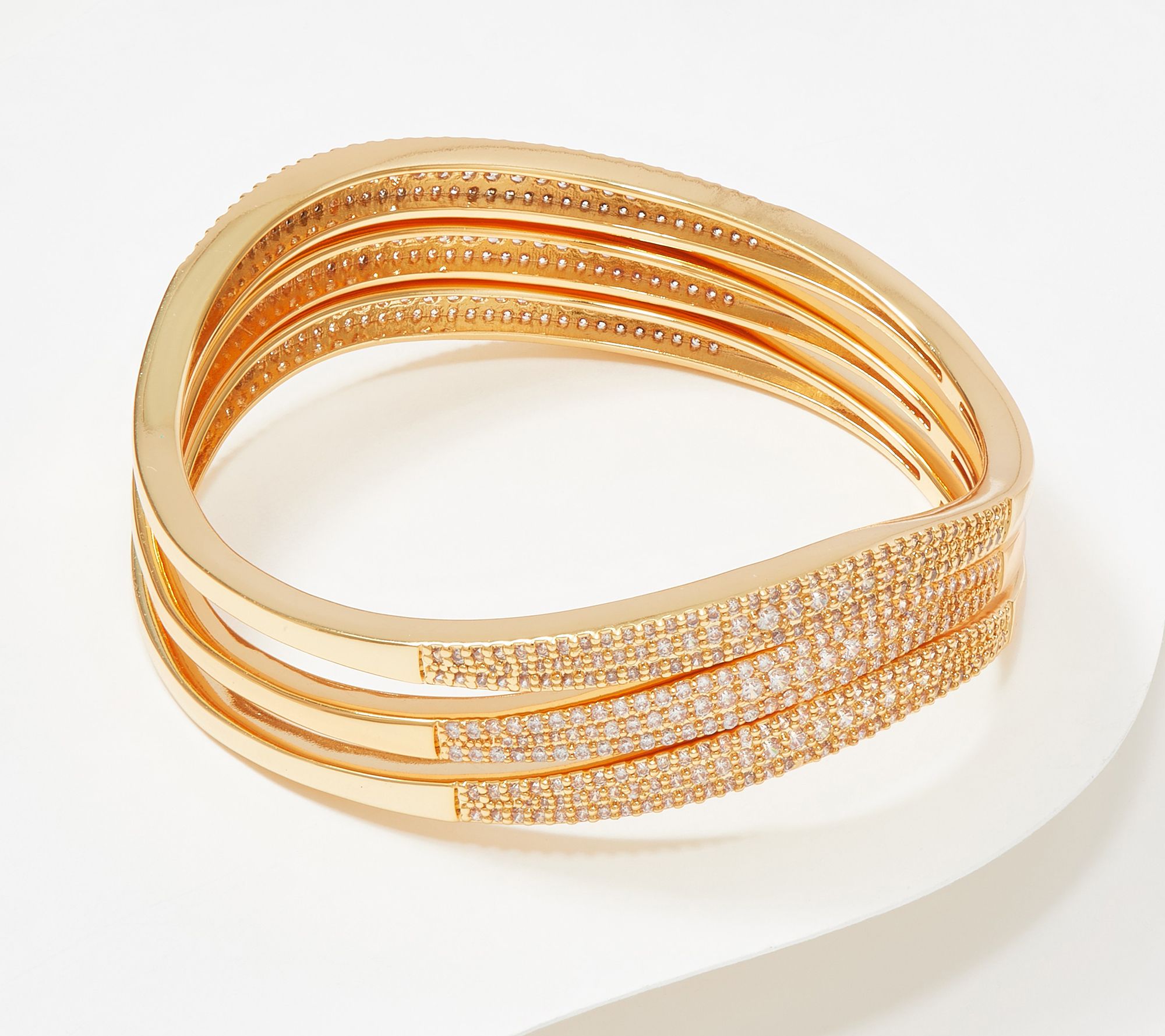 These sculptural bangles are embellished with micro-pave cubic zirconia Diamonique simulated diamonds, offering just the right touch of sparkle to daytime or nighttime attire.