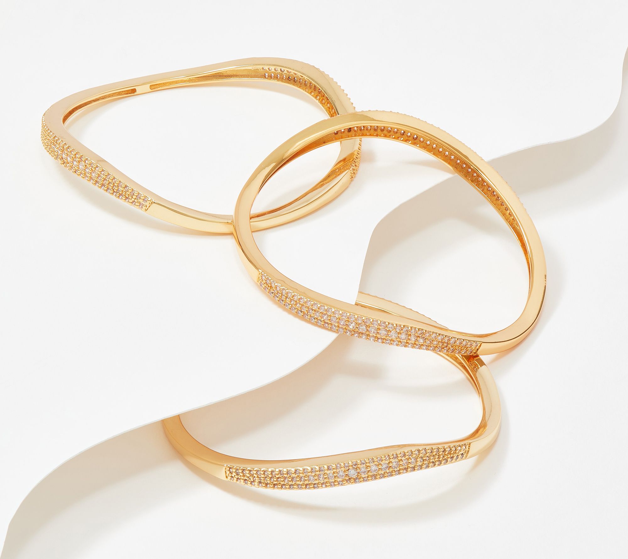 • Round, wave-shaped bangles; slip-on design; pave-set, round Diamonique simulated diamonds