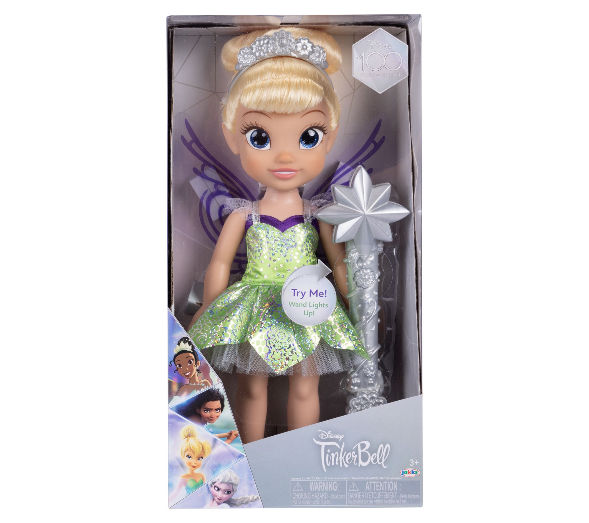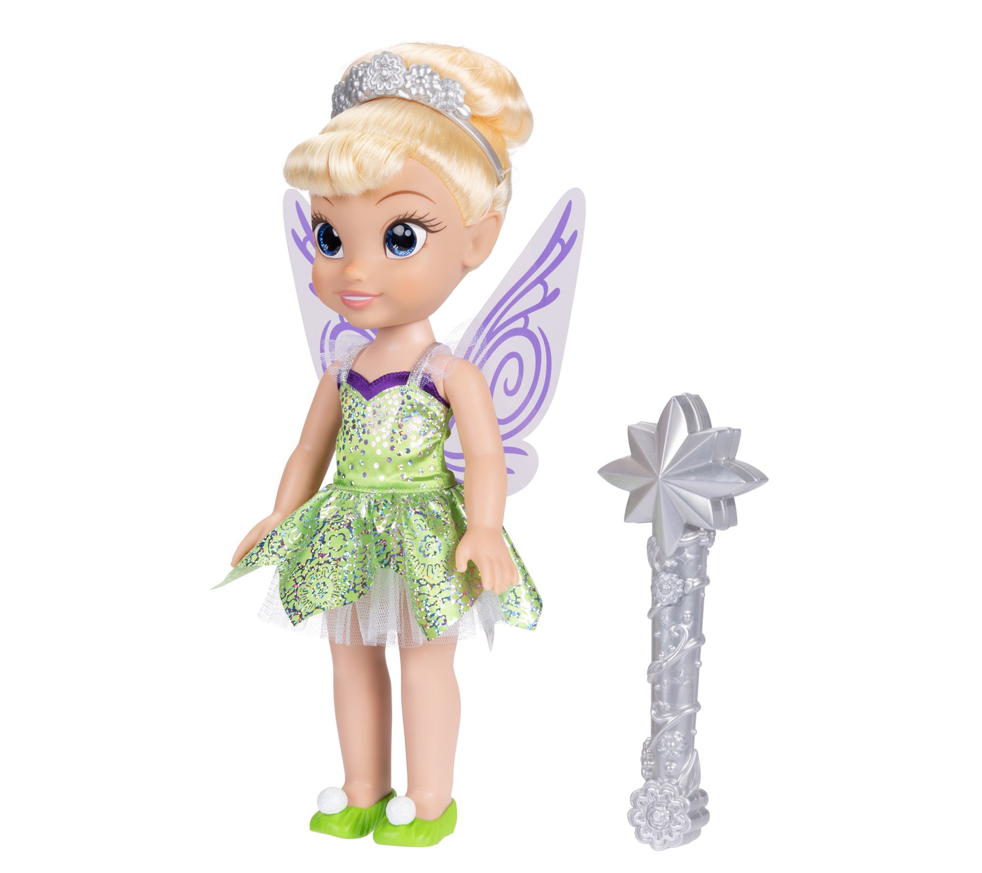 • Includes Tinker Bell doll with 3 AAA batteries and glitter-filled wand with 3 button-cell batteries