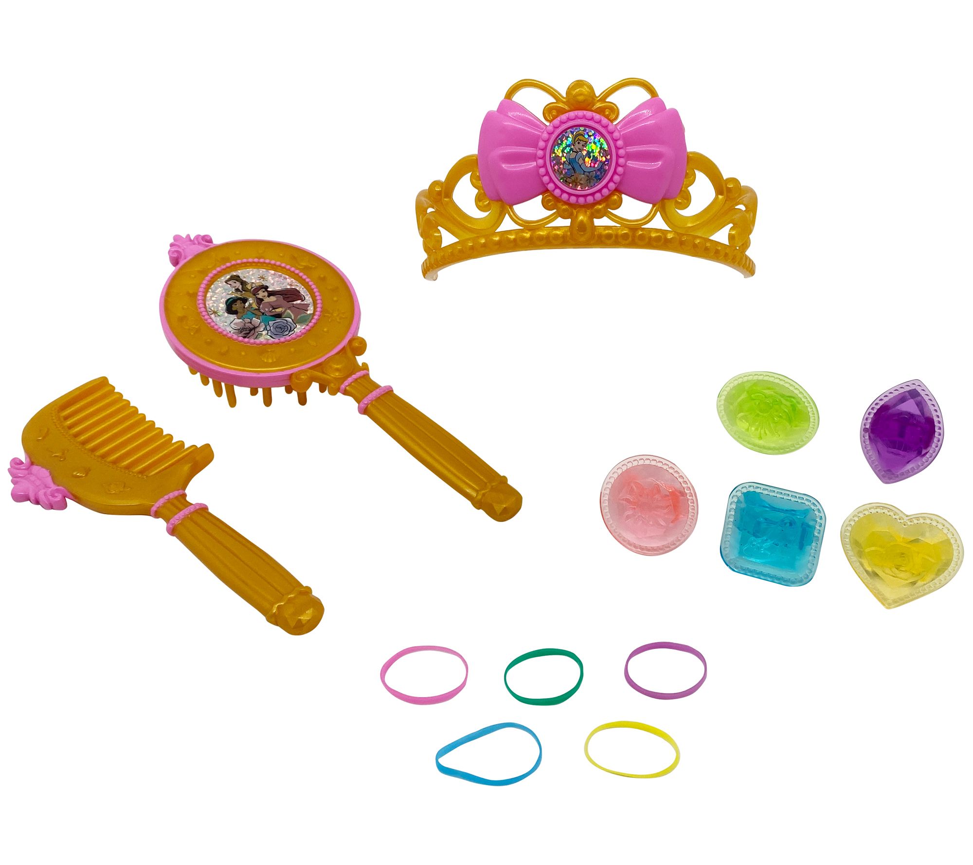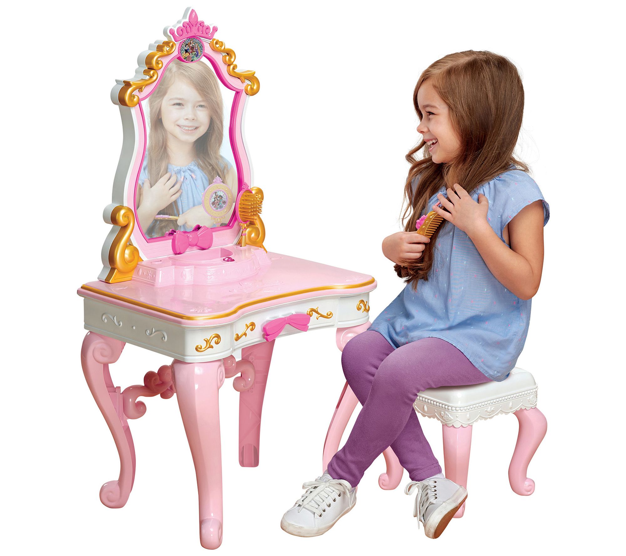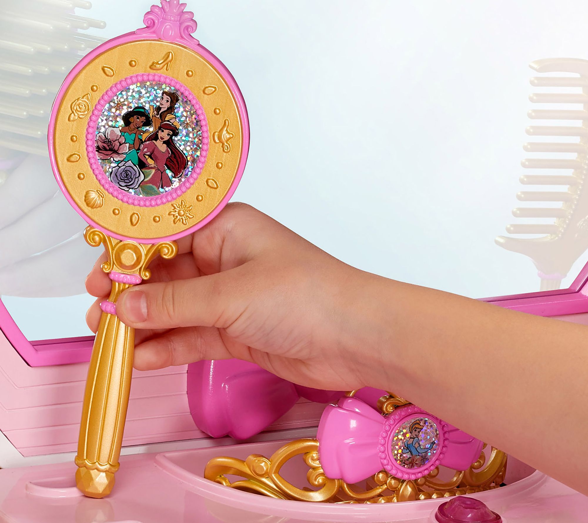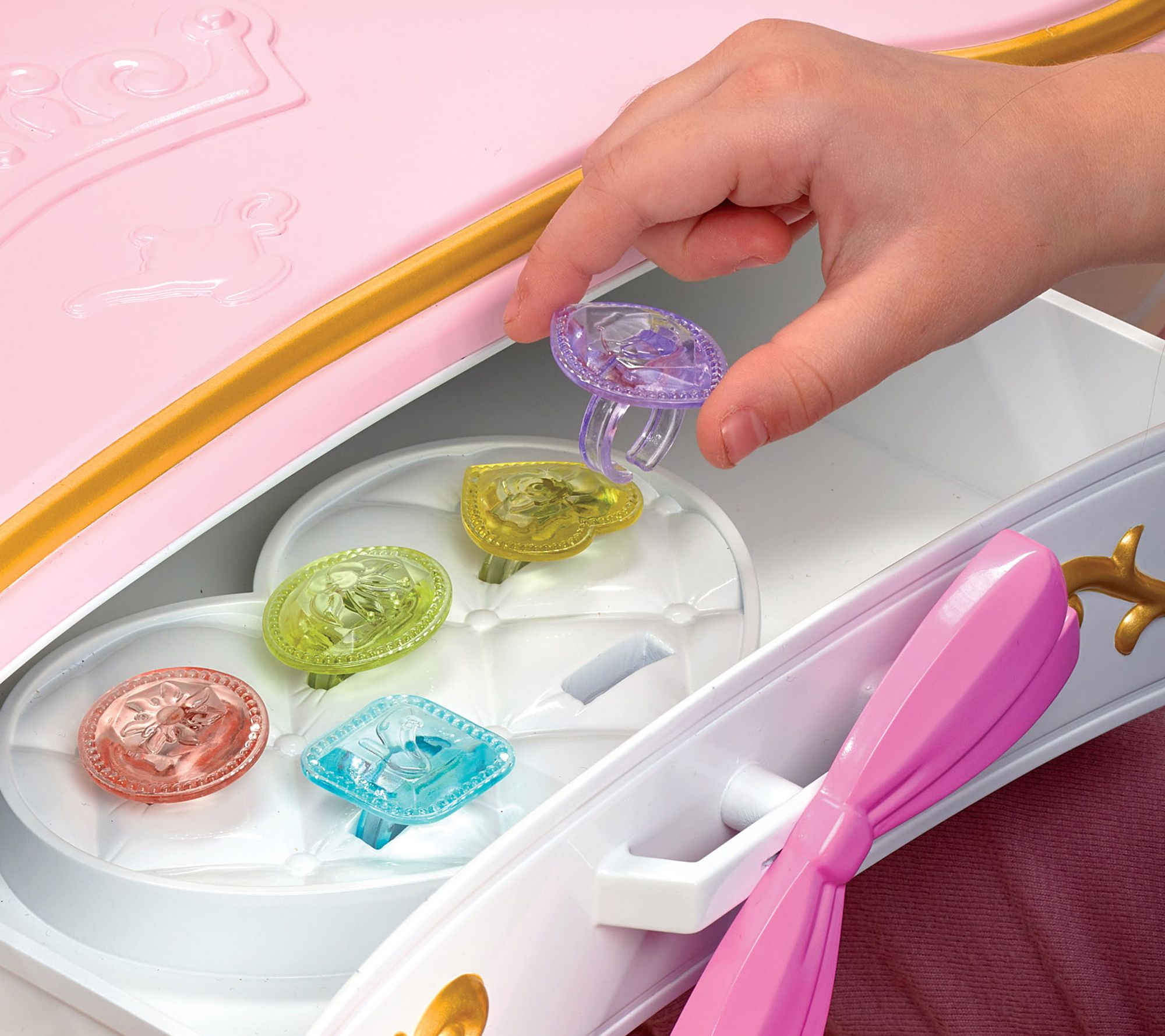 • Includes musical vanity, stool, brush, comb, tiara, five princess rings, and three AA batteries