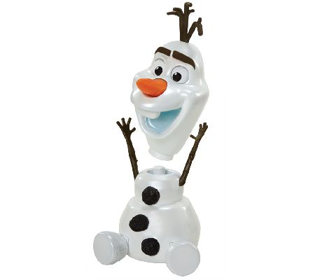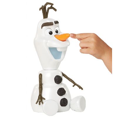 Everyone's favorite summer-loving snowman is back for more adventures. Ready for fun, Disney's Frozen animated Olaf-a-Lot talks, laughs, and more. Push Olaf's carrot nose to hear him say over 50 different familiar phrases from the movie. Push his nose again, remove his head, or turn his head upside down to hear even more sayings. From Disney.