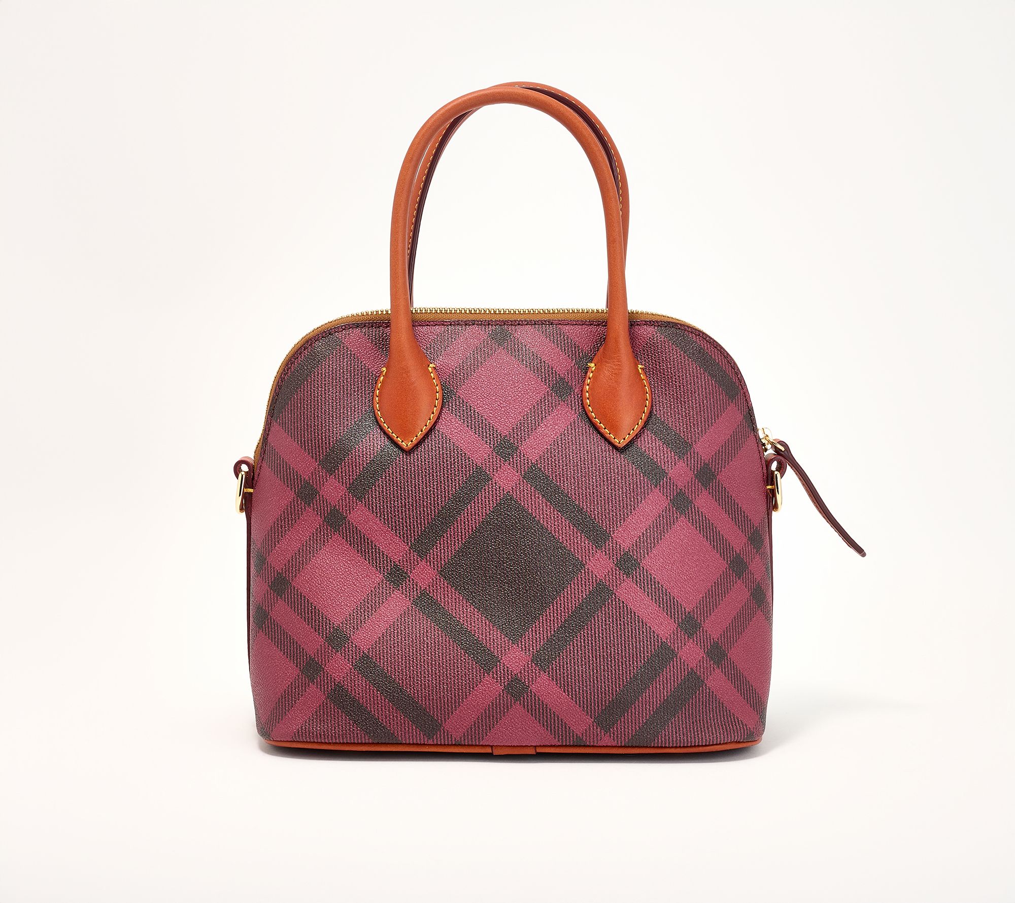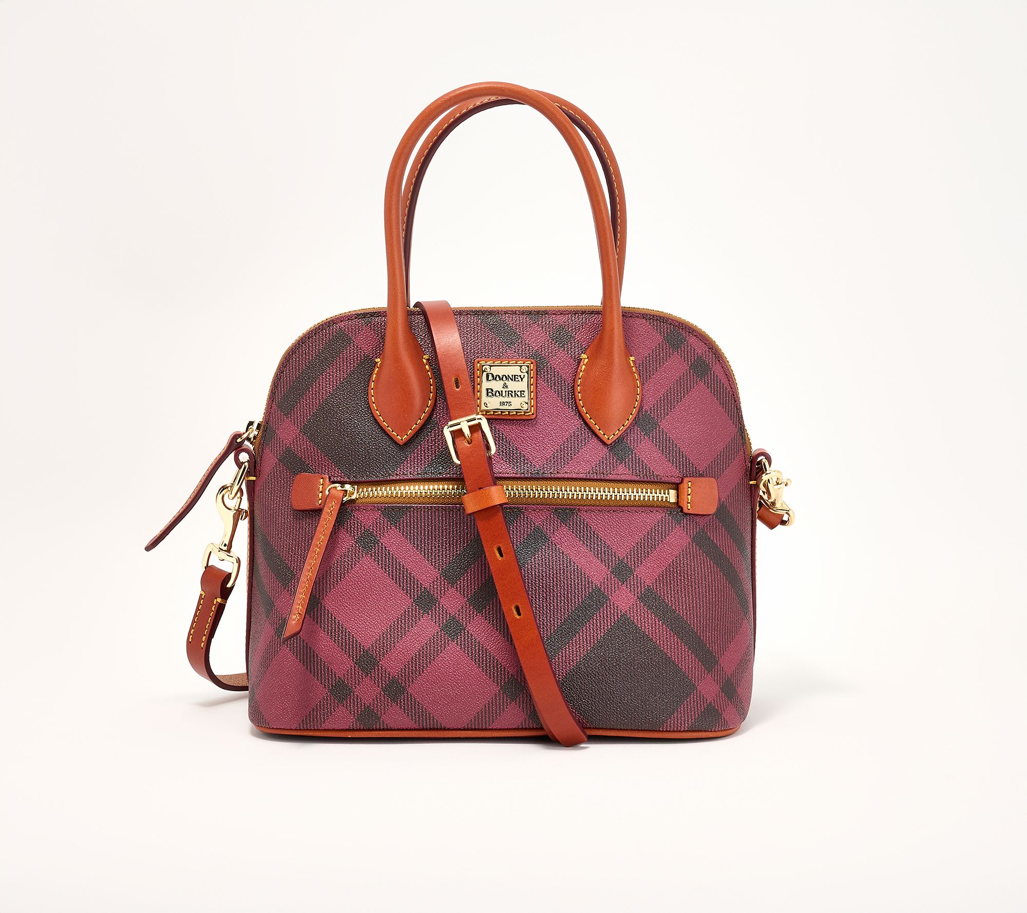 Bringing both function and flair to your everyday routine, this coated cotton domed satchel offers convenient carry options whether you favor the structured top handles or the adjustable shoulder strap. Ample storage (including exterior and interior pockets) helps keep your essentials organized, while sturdy bottom feet offer added stability in busy commutes or weekend outings. From Dooney & Bourke.