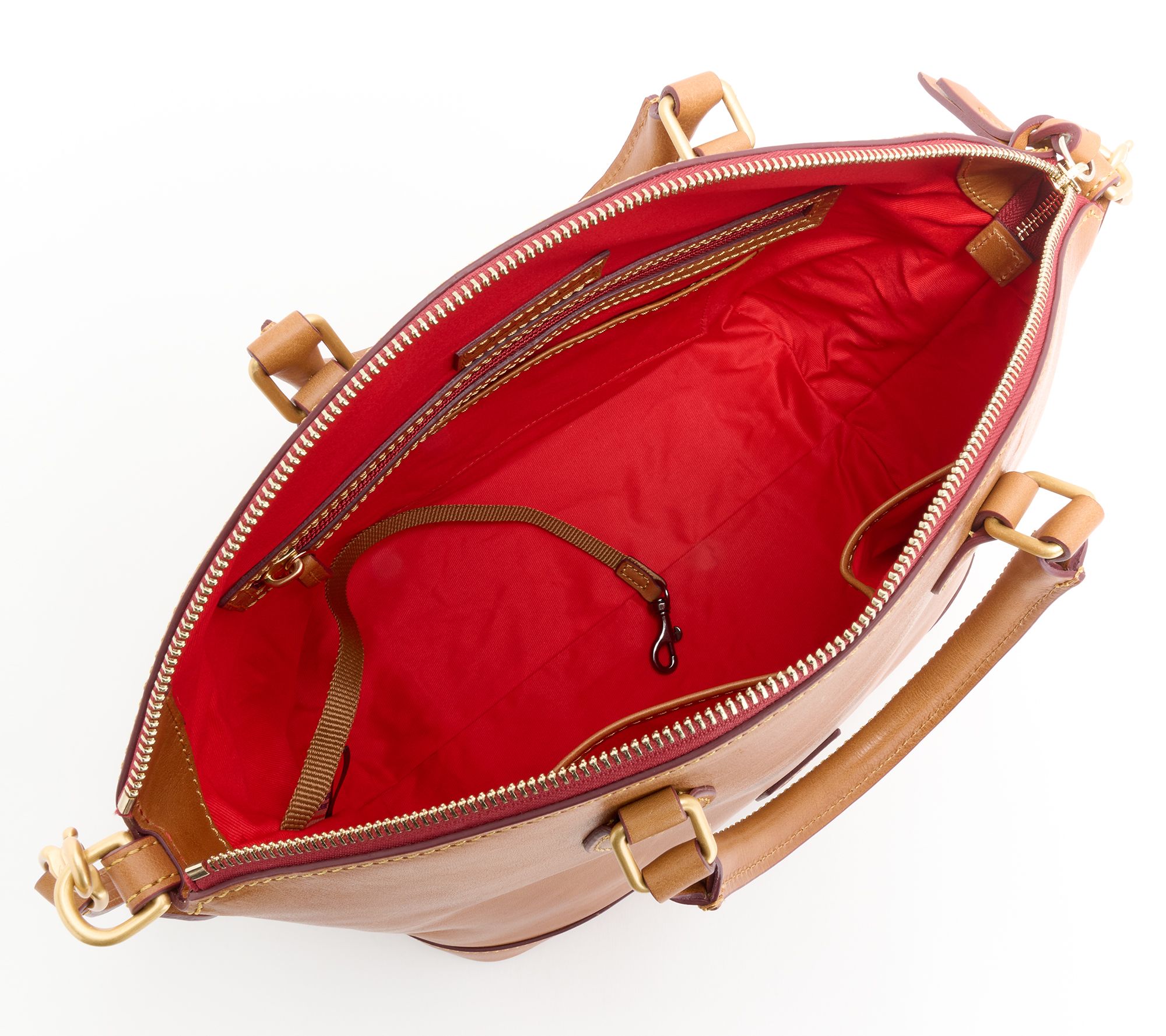 • Lined interior, front-wall zip pocket, front-wall slip pocket, two back-wall slip pockets, key hook