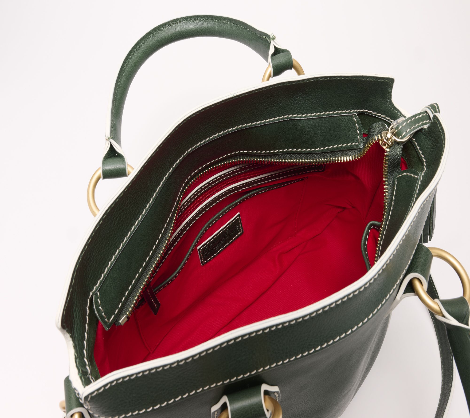 • Lined interior, front-wall zip pocket, front-wall slip pocket, two back-wall slip pockets, key hook