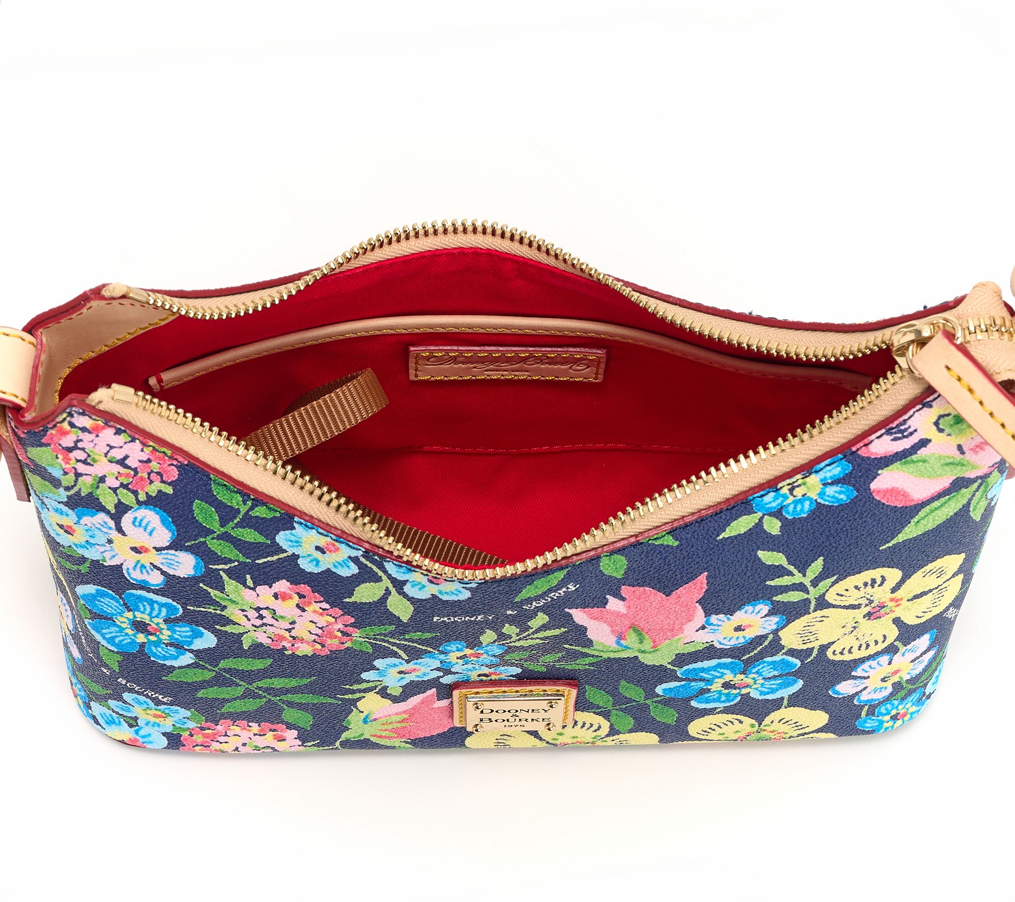 A refreshing bouquet to enjoy every day. Brighten brunch with friends or busy weekdays with a floral baguette handbag that brings together pretty bursting blooms with practicality. Room for must-haves, double inside pockets for essentials, plus an easy-access key hook and sturdy bottom feet make it perfect for days spent on the move. From Dooney & Bourke.