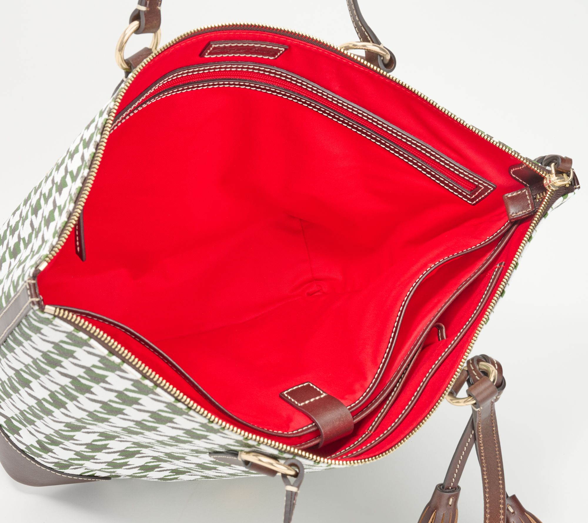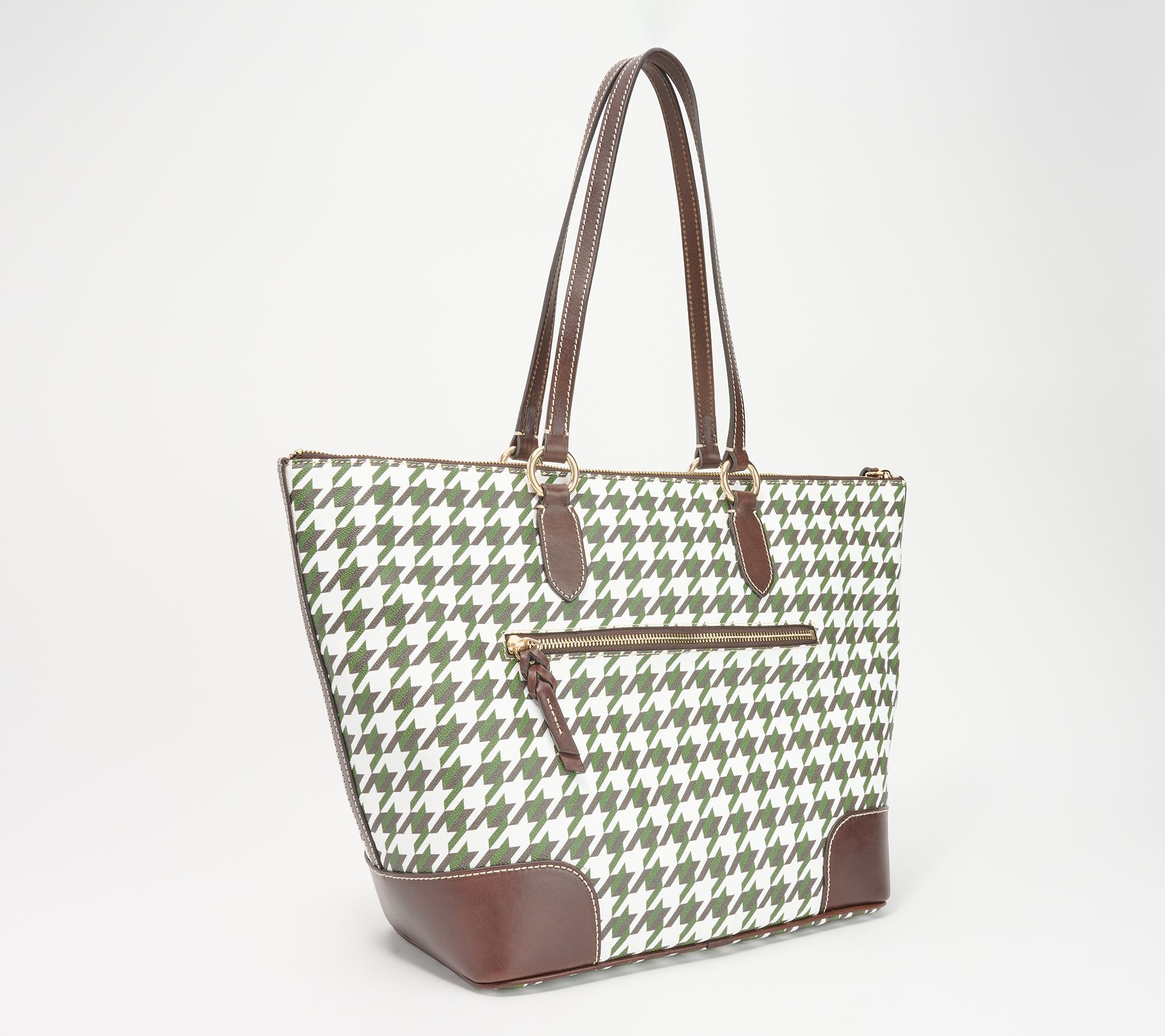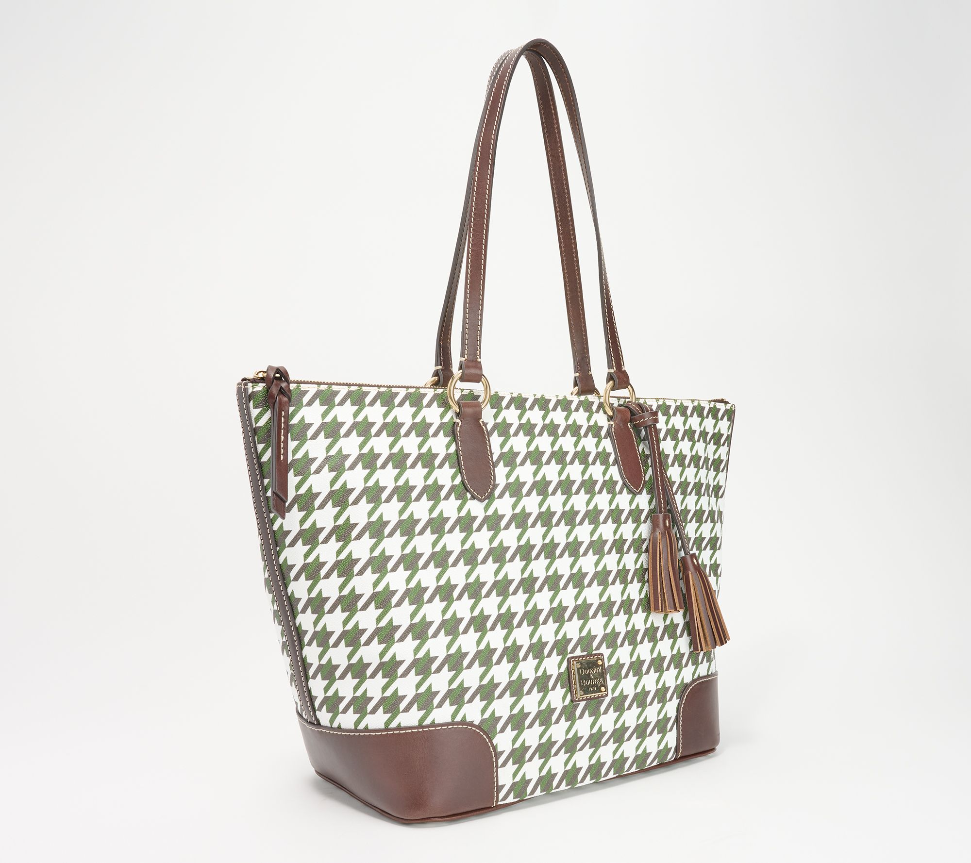 You're a real go-getter and you need a bag that can keep up. This gorgeous tote has a spacious interior (for your keys, cards, notebook, tablet, and tech), with a classic houndstooth print and a decorative tassel that you can remove when the mood strikes. From Dooney & Bourke.