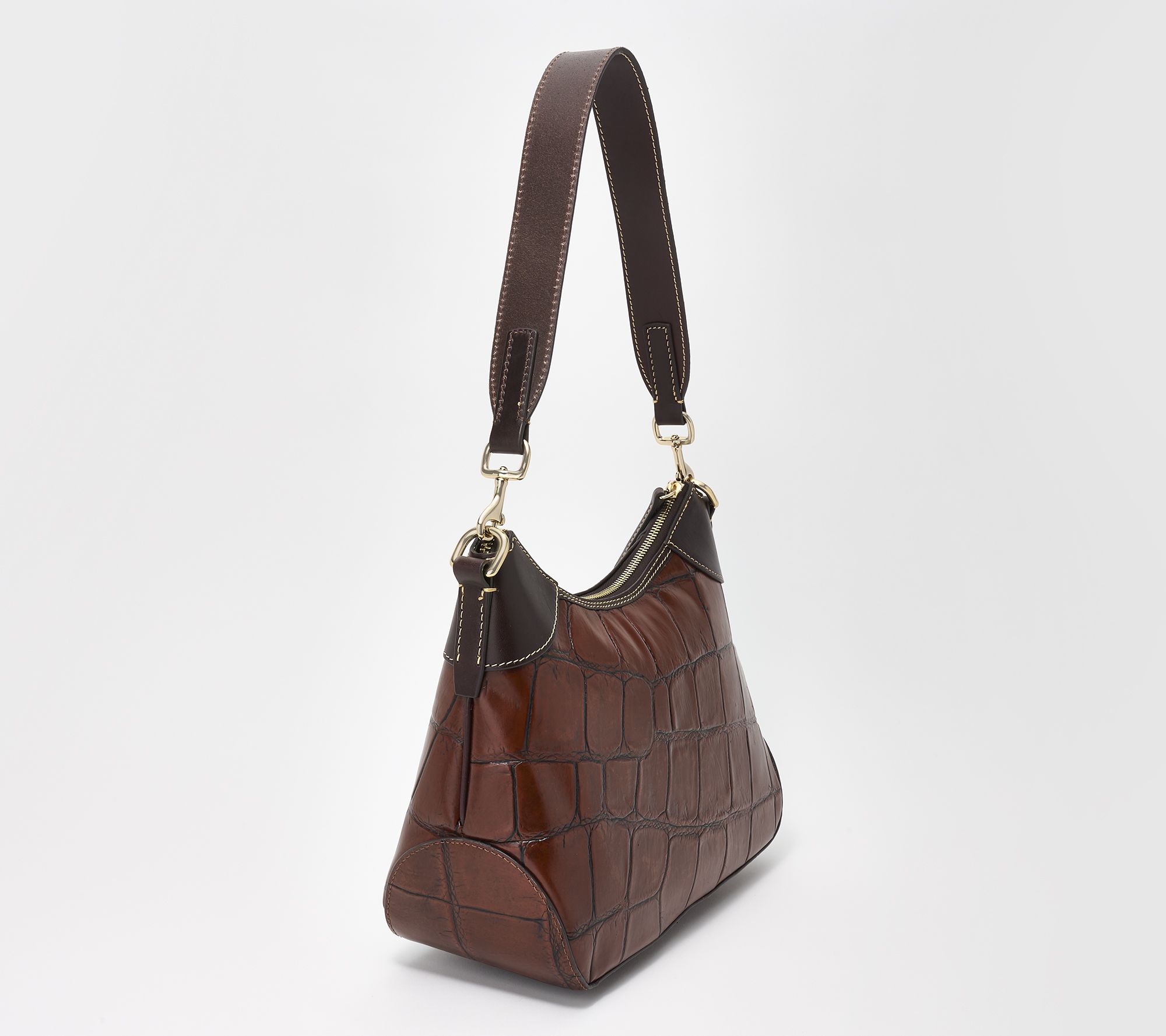 Elevate your style with this leather croco-embossed hobo shoulder bag. Featuring a removable handle, zip closure, and multiple pockets, this bag combines functionality with timeless elegance. Perfect for any occasion, it’s a must-have addition to your accessory collection. From Dooney & Bourke.