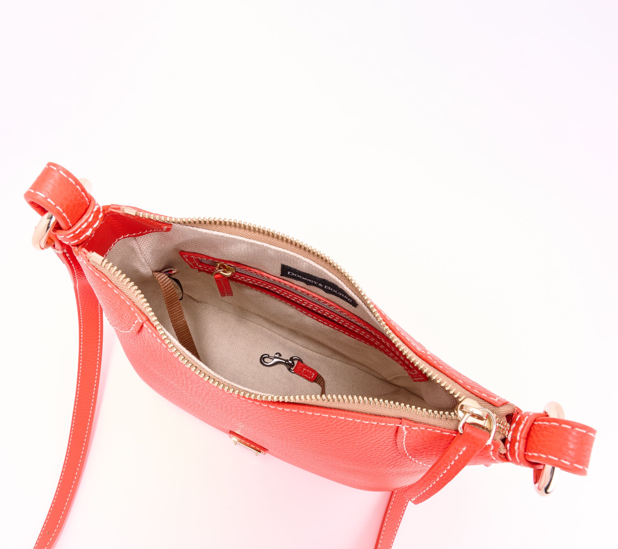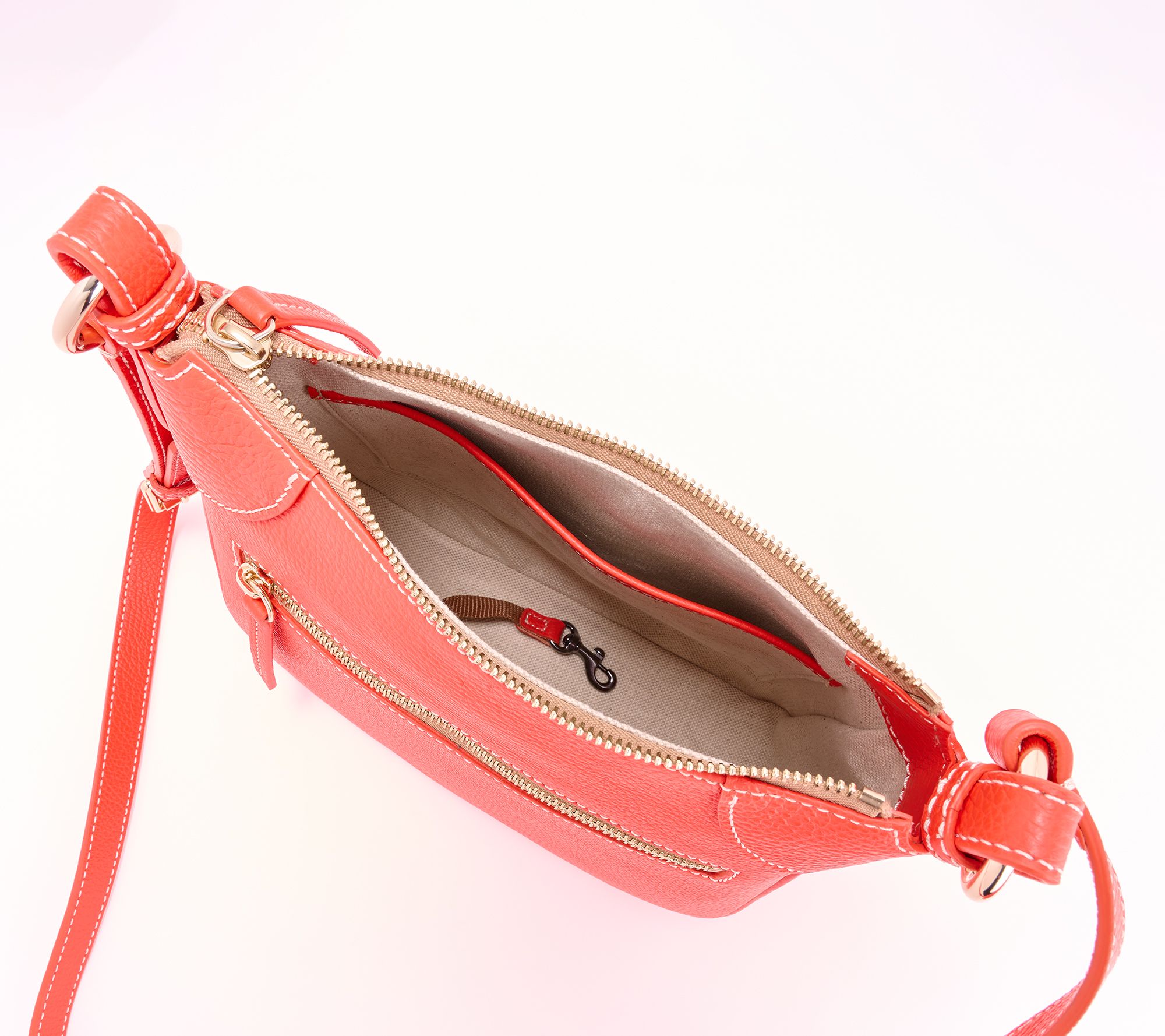 • Lined interior, front-wall zip pocket and slip pocket, back-wall slip pocket, key hook
