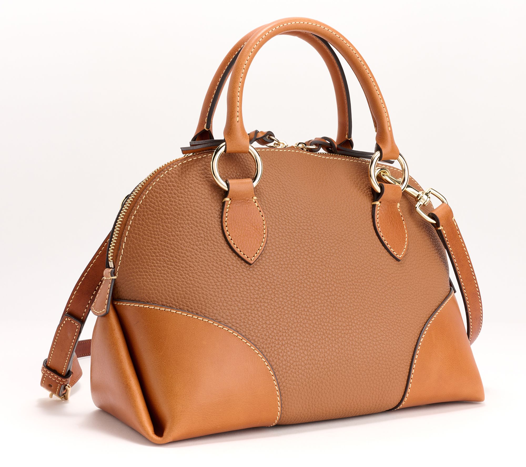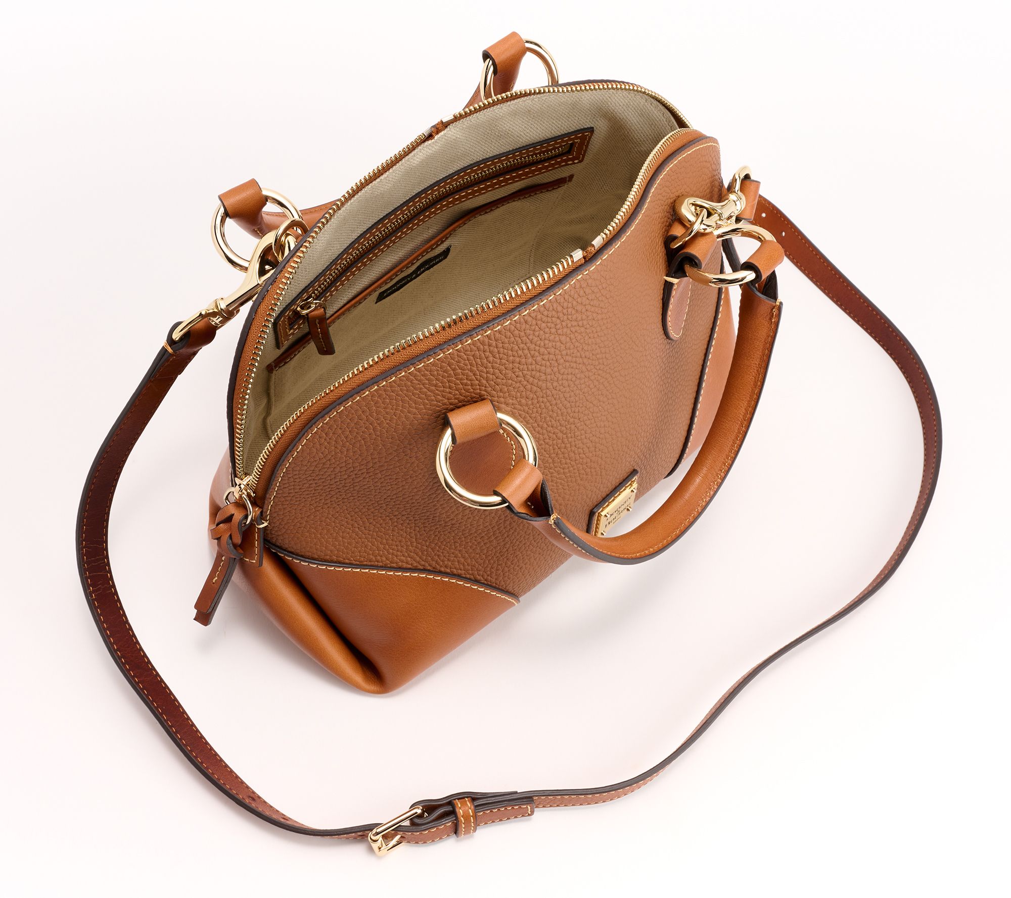 Crafted of luxe pebbled leather, this domed satchel is primed for everyday carrying. Inside there is plenty of organization for your keys, wallet, lip gloss, and other daily essentials. From Dooney & Bourke.