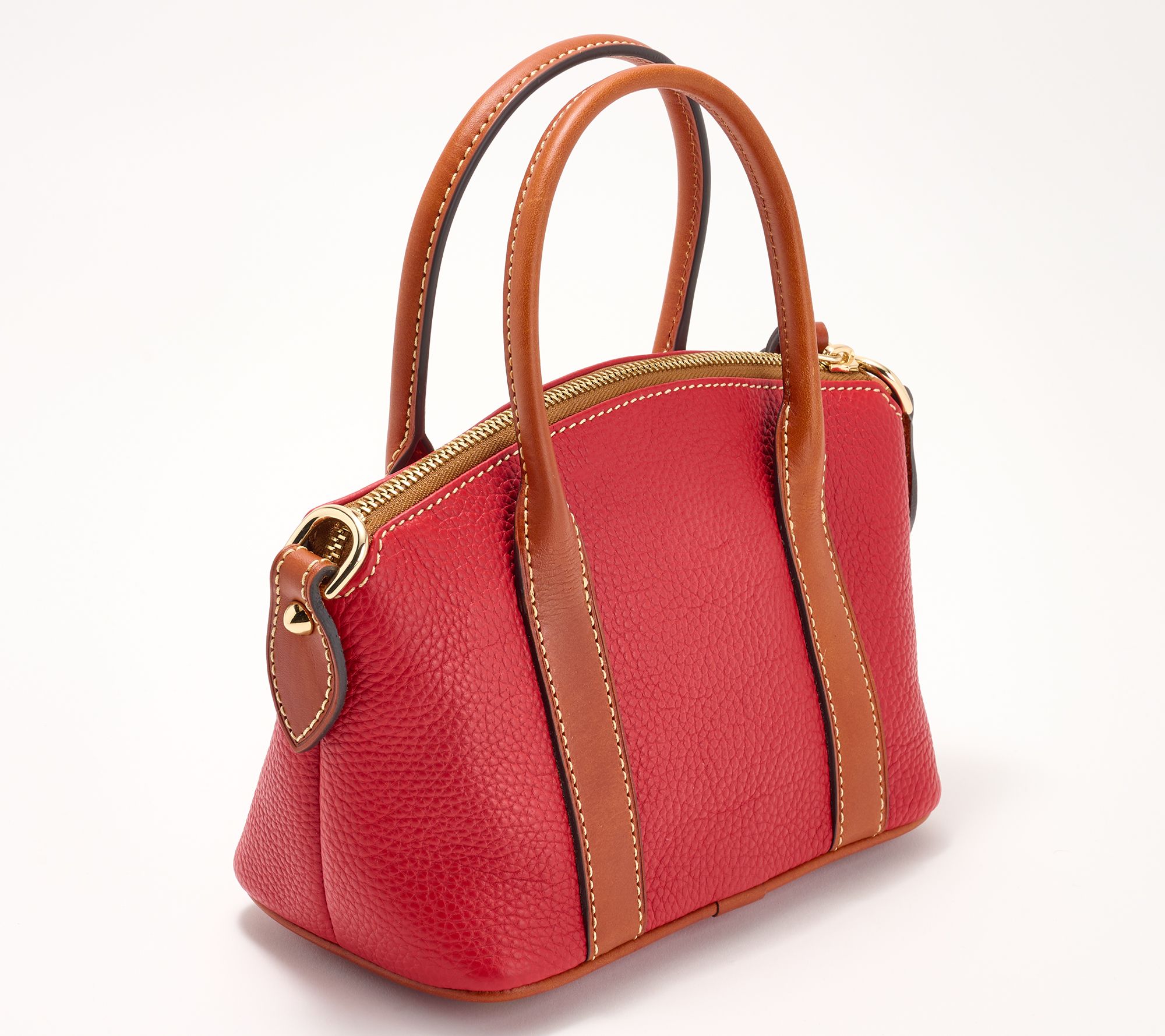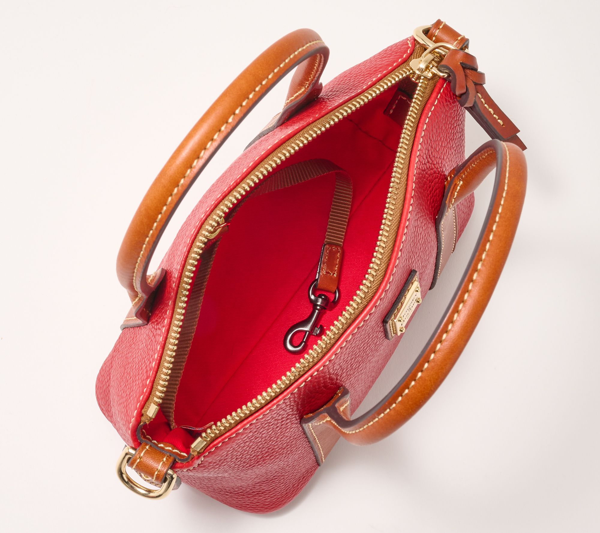A small satchel with serious appeal. From the luxe pebble leather body to the smooth classic trim, the Dooney & Bourke Madeline satchel gives you a top-of-the-world feeling every time you carry it. While the stylish design speaks for itself, don't forget the inside that has plenty of room and pockets to keep you completely organized. From Dooney & Bourke.