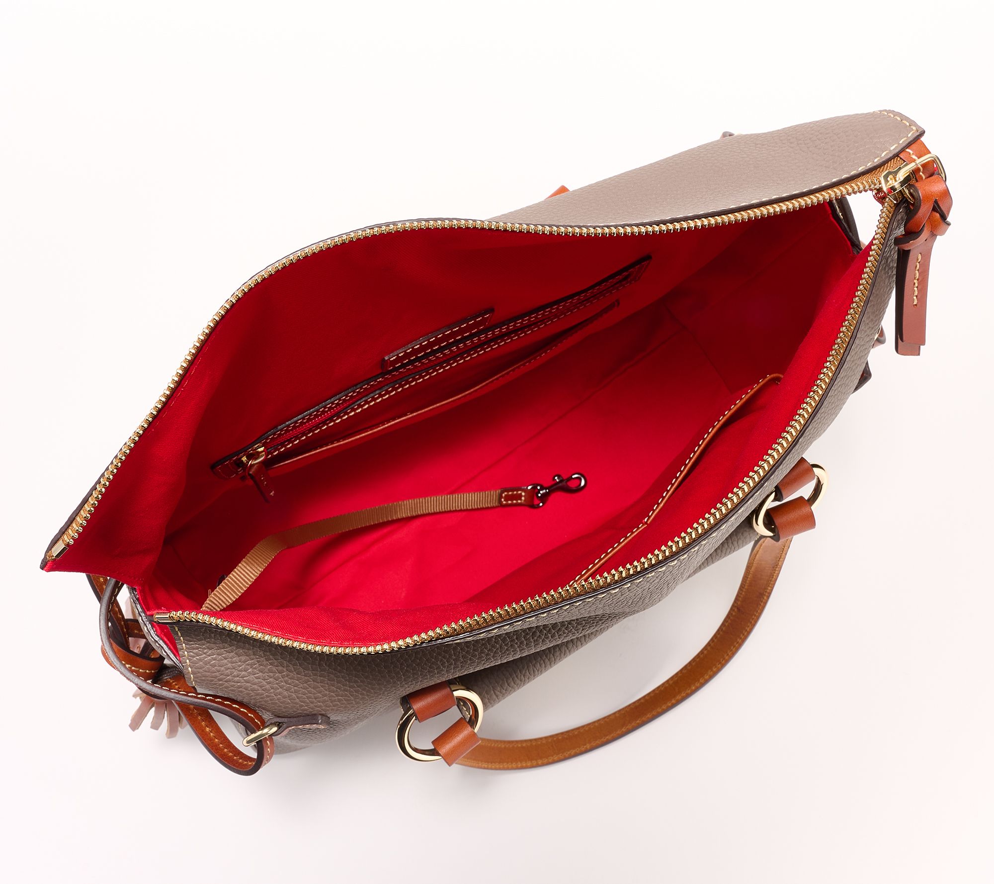 • Lined interior, front-wall zip pocket and slip pocket, two back-wall slip pockets, key hook