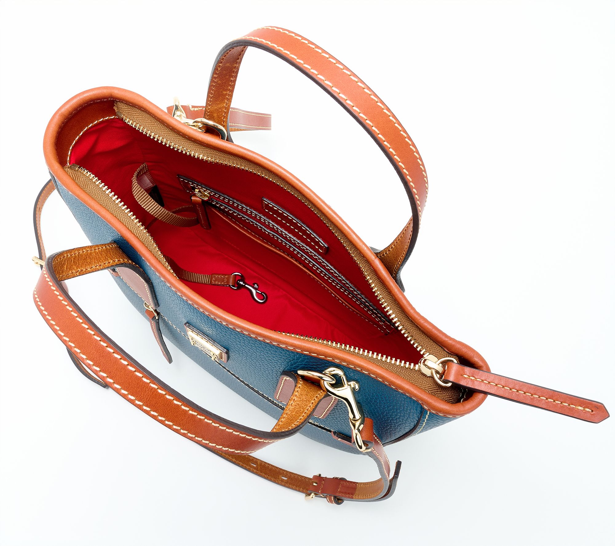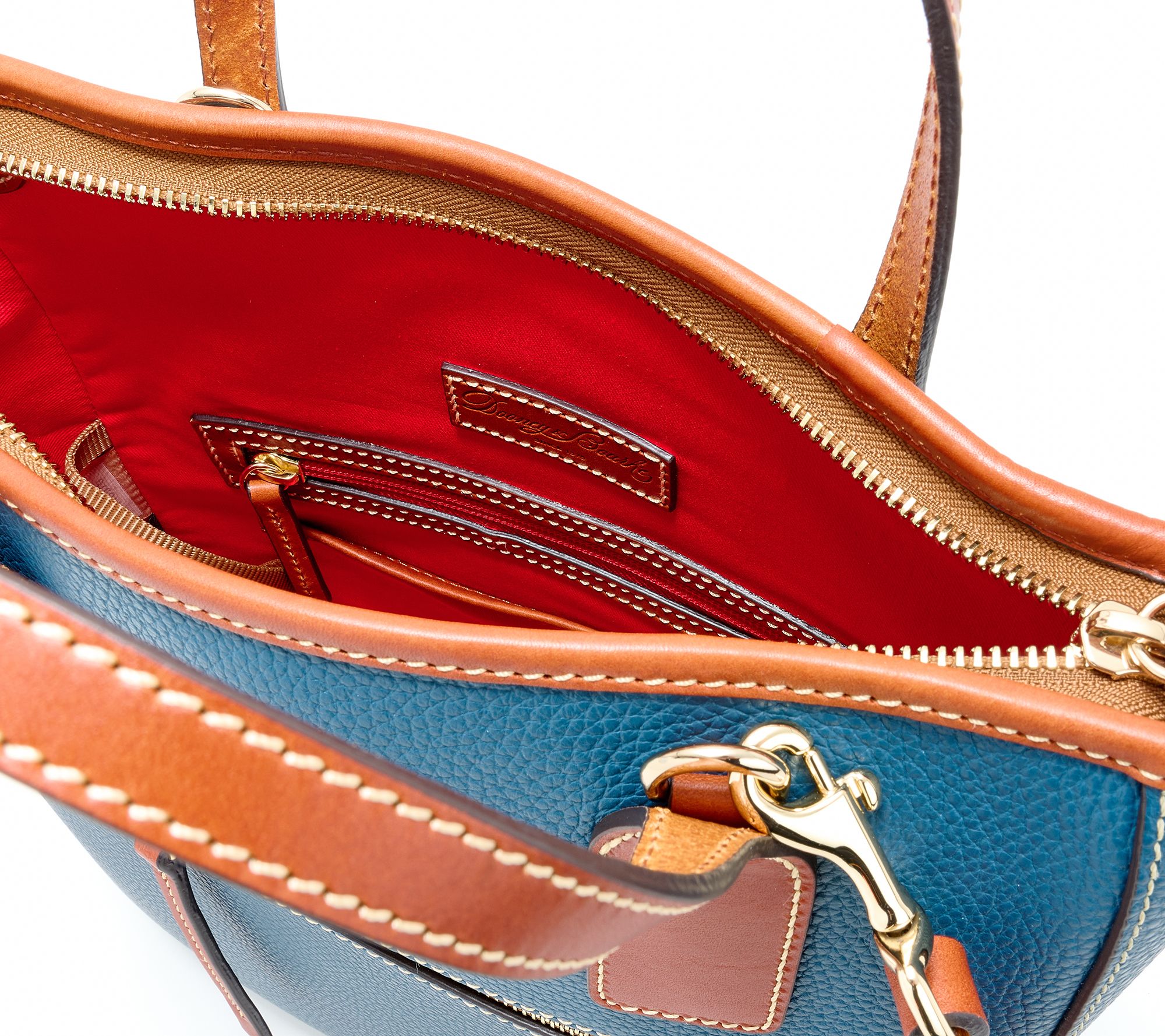 • Lined interior, front-wall zip pocket and slip pocket, two back-wall slip pockets, key hook