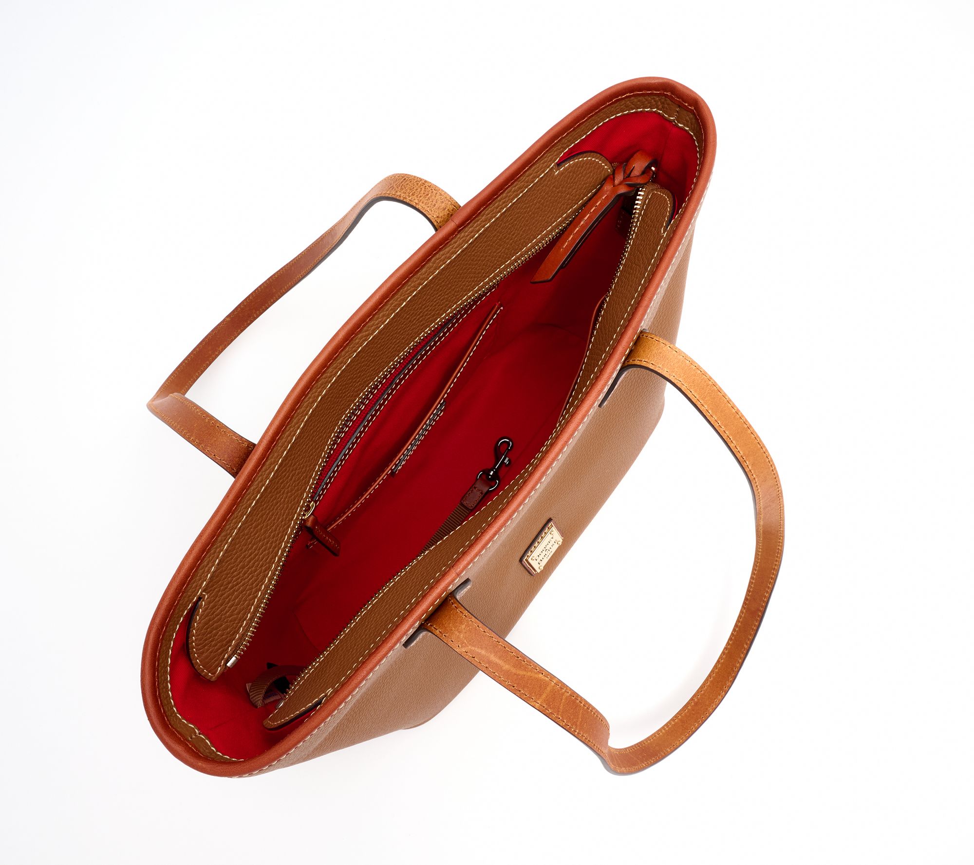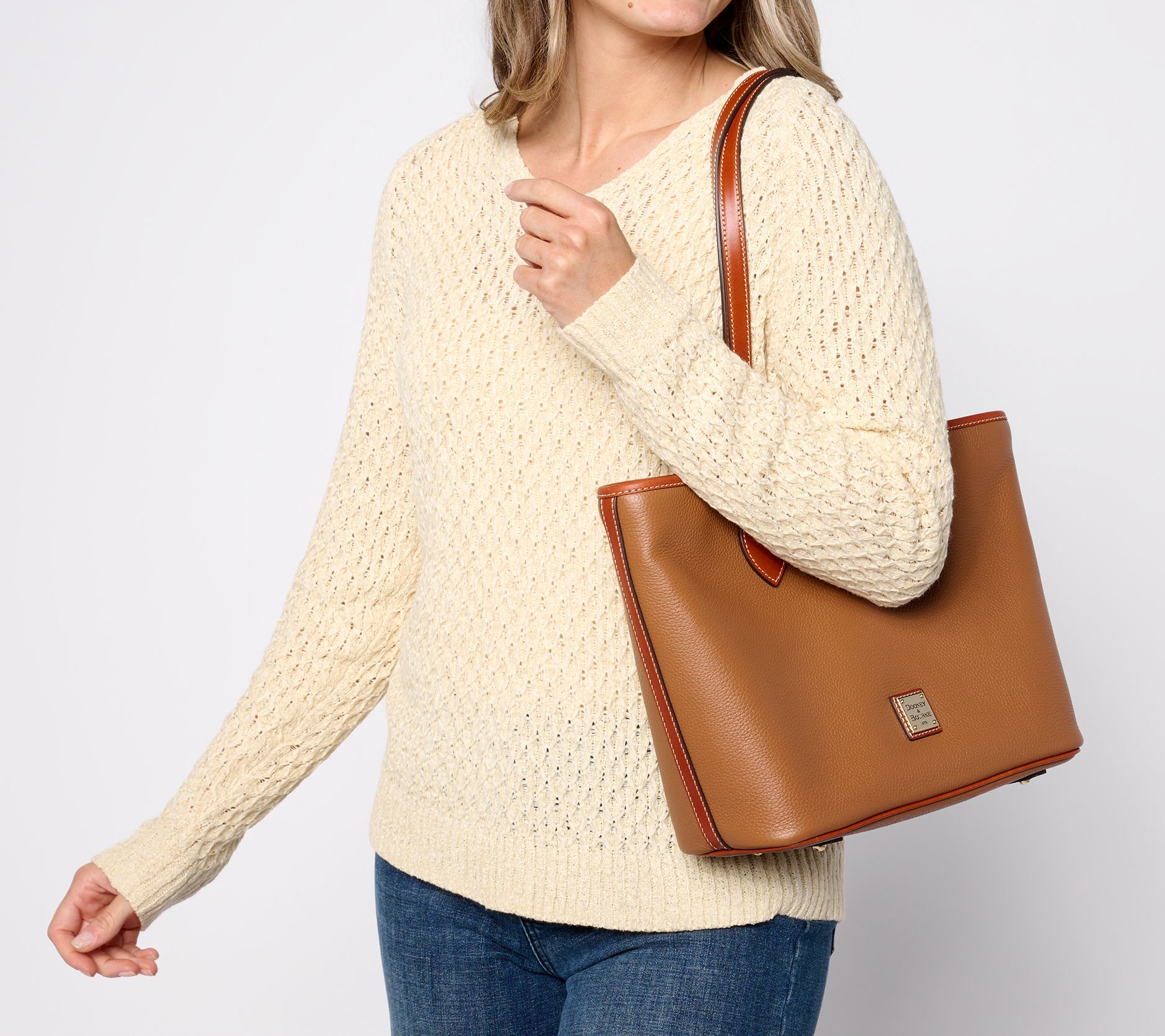 Heading out for the day, you'll love how this roomy tote fits everything from a book to your small tech, while thoughtful pockets streamline your routine so keys and your phone are always right where you need them. Pebbled leather creates a classic look you can take to the office, a meeting, or coffee with friends. From Dooney & Bourke.