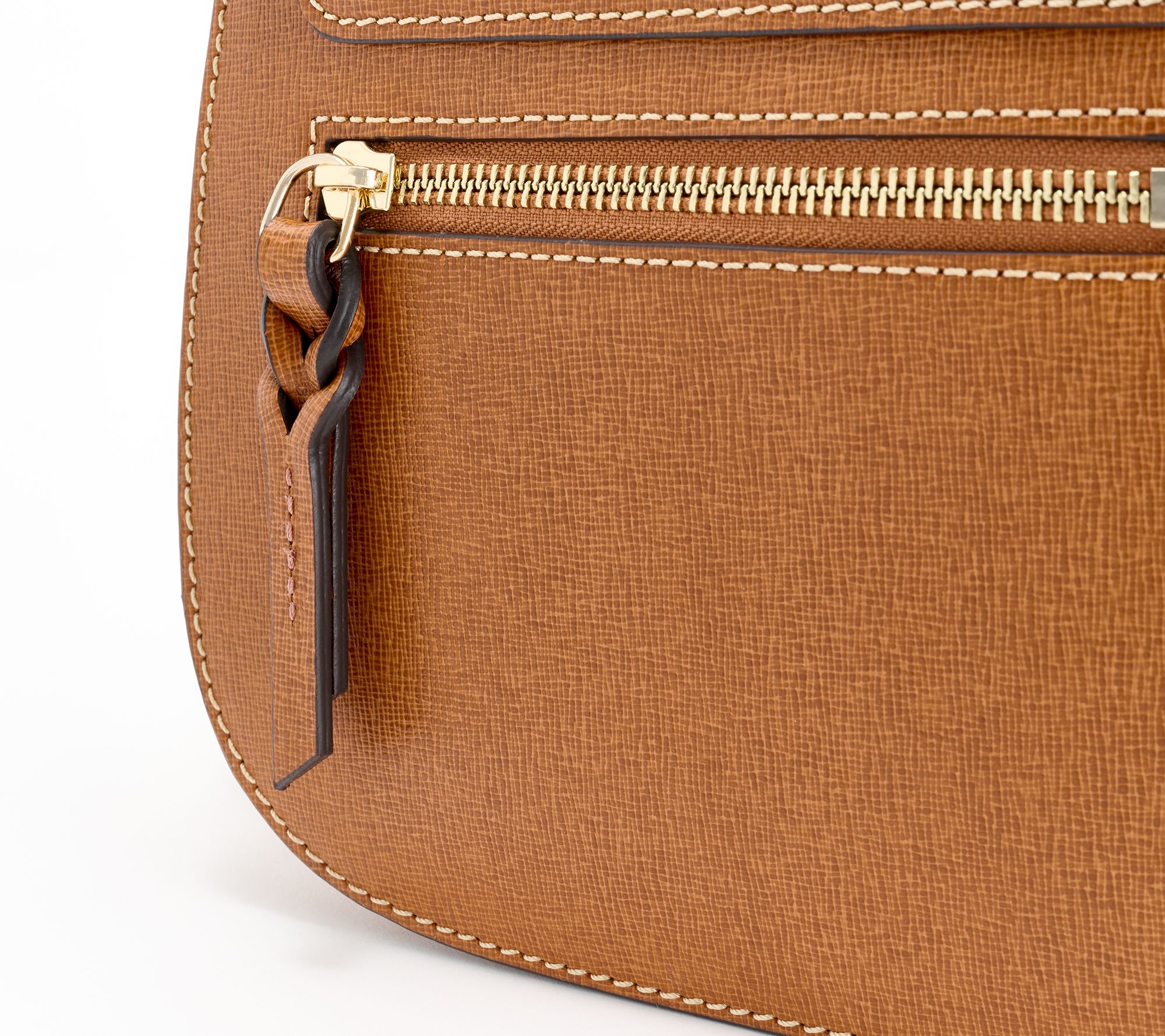 • Saffiano leather body, adjustable/removable strap, flap with magnetic snap closure, metal plated logo, back zip pocket, goldtone hardware
