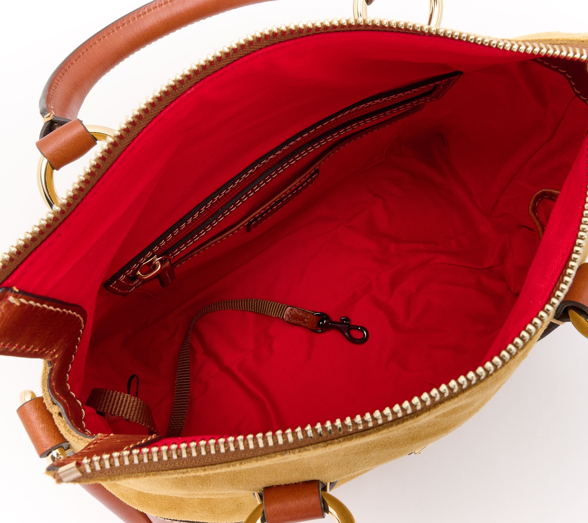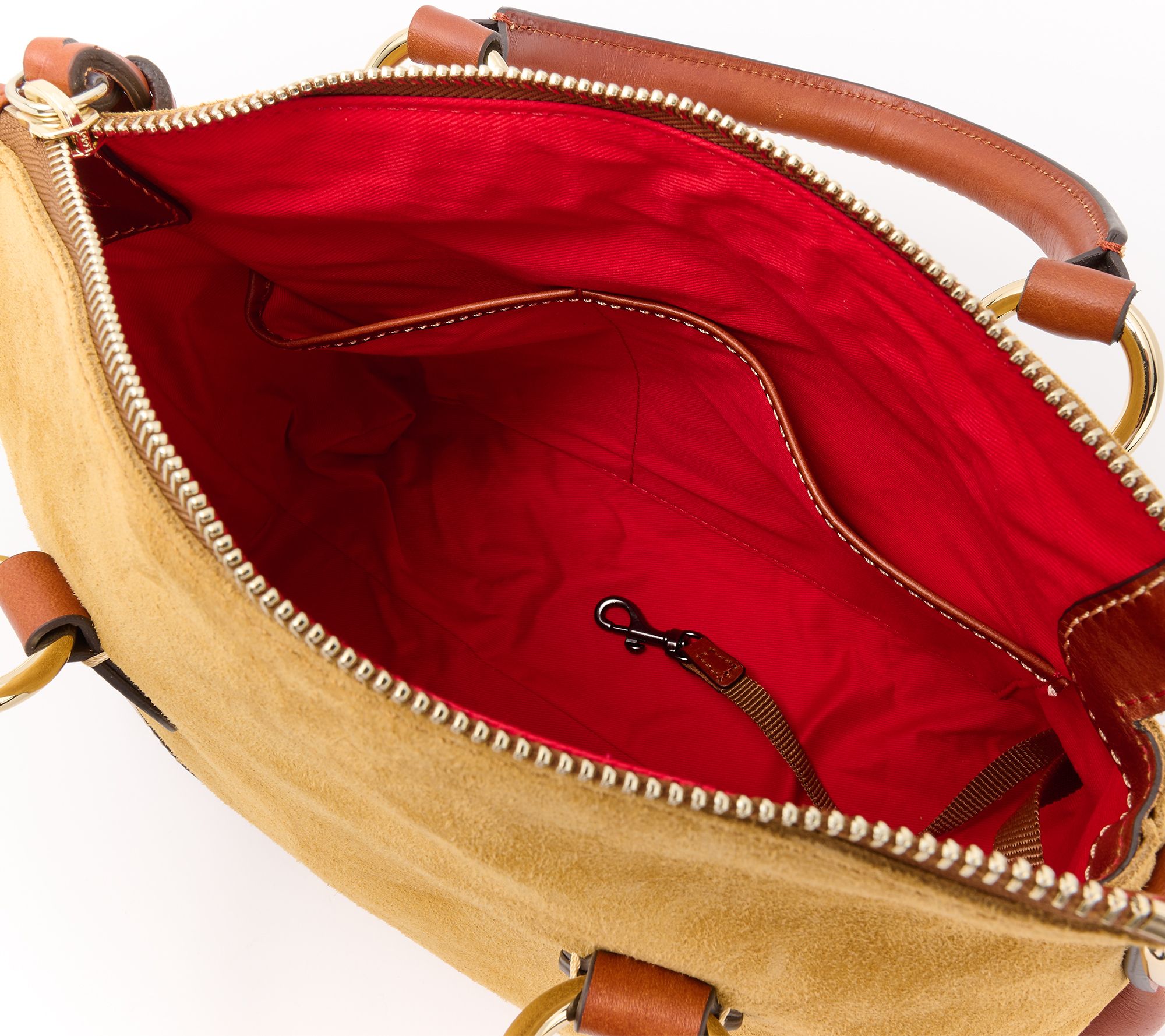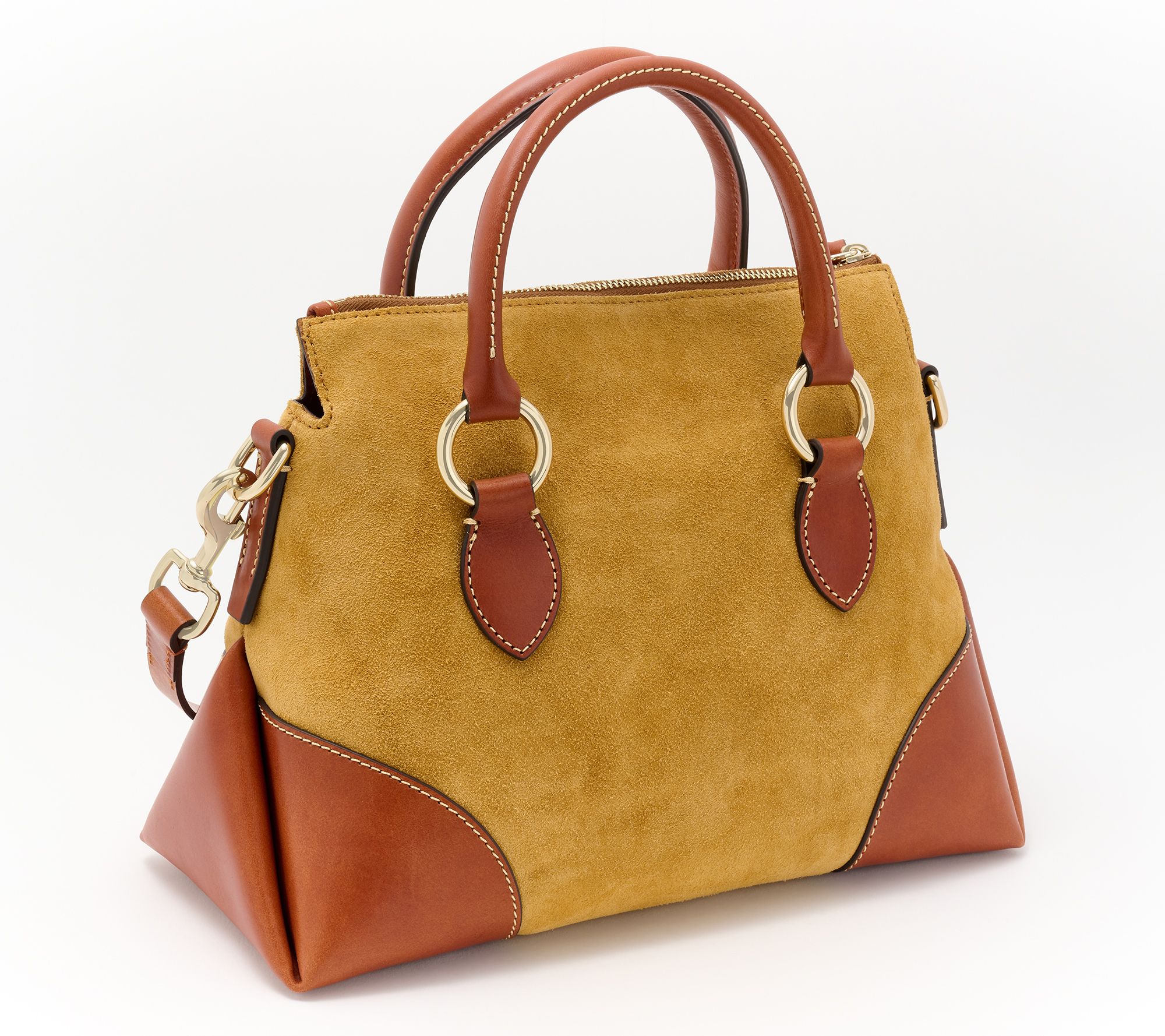 The best of both worlds, this sturdy suede satchel features luxe Florentine leather trim. With a structured silhouette and timeless touches (like a double-handle design with rich, goldtone hardware, this bag has everything you need and then some. From Dooney & Bourke.