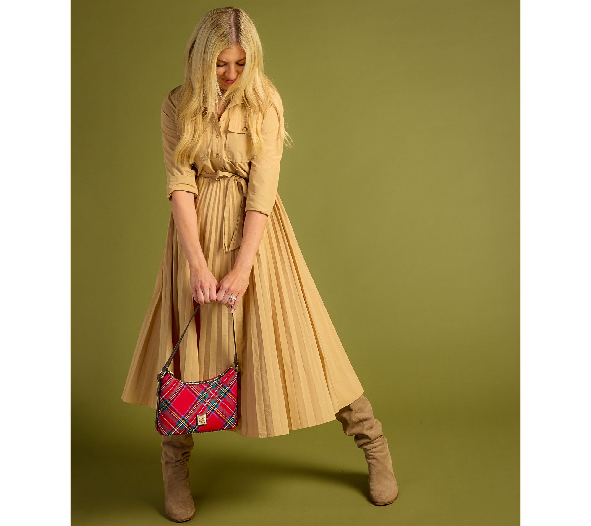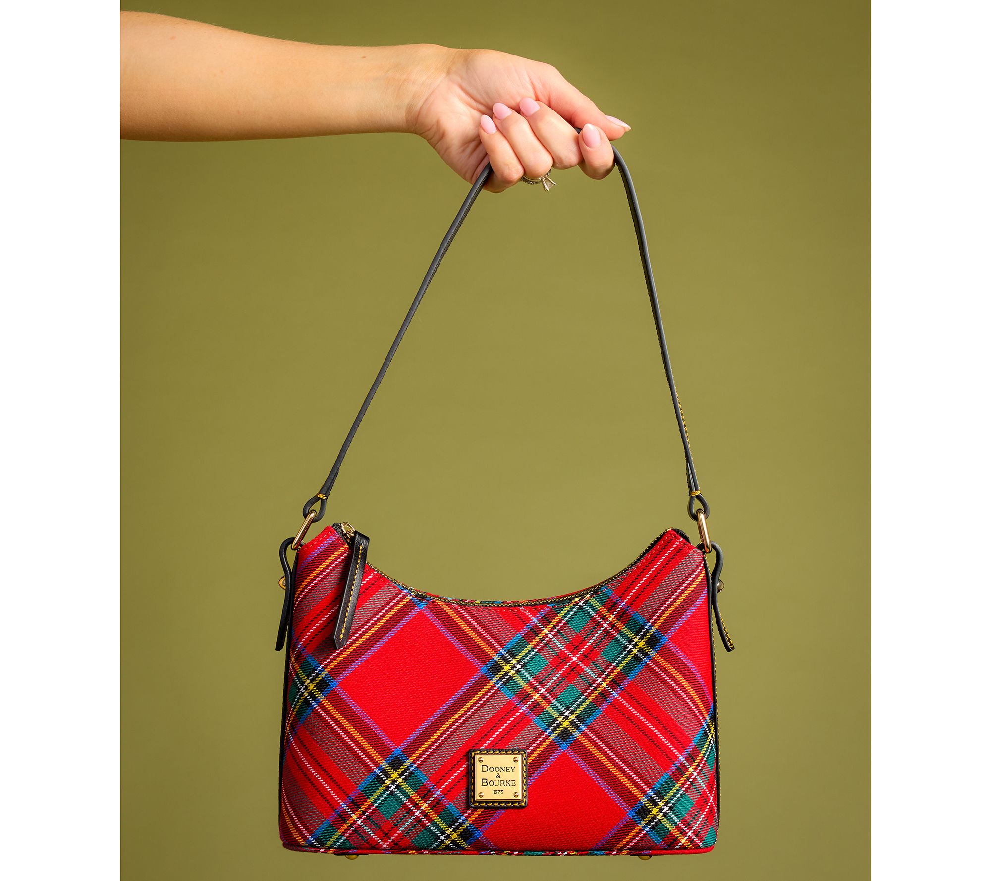 A pretty plaid bag is never a bad idea. Dooney & Bourke always gets it right and this tartan baguette is no exception. The cotton carryall features a convenient top handle with interior slip pockets and a key hook for organization. Sport this style throughout the holiday season and beyond. From Dooney & Bourke.