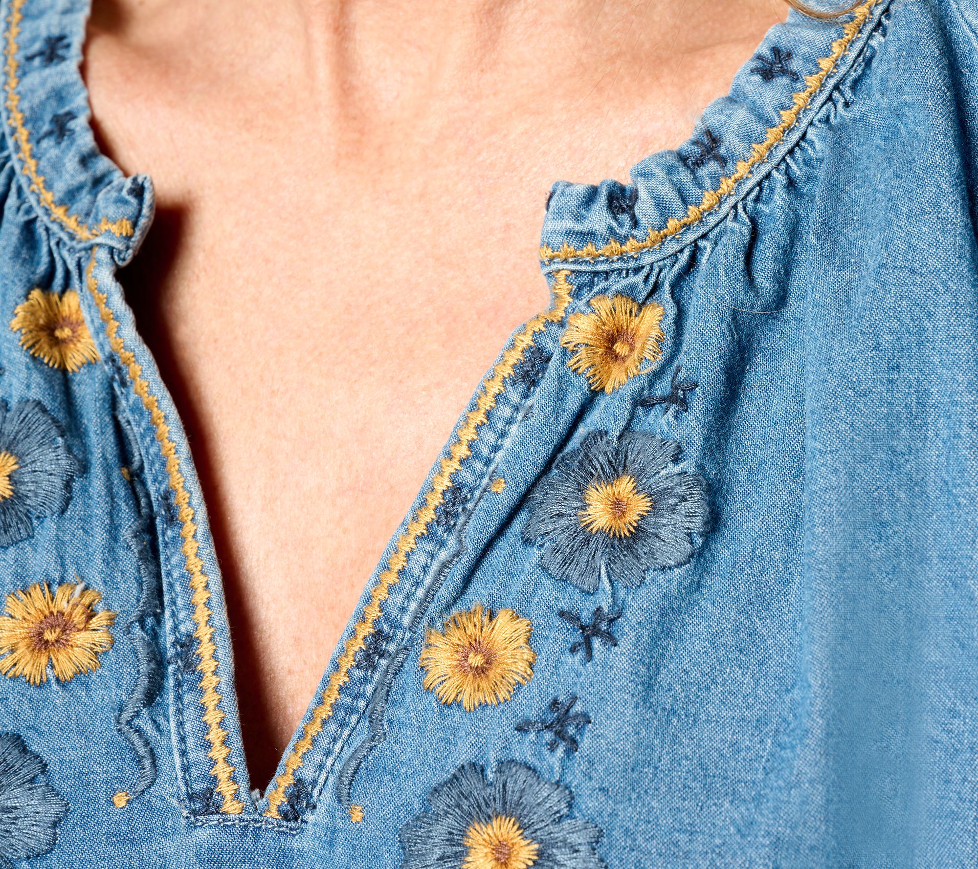 Forget about where to wear it ('cause... everywhere!). Prep yourself for Where did you buy it? from green-eyed girlfriends! This trend-right embroidered chambray blouse brings out the envy in everyone. From Driftwood Jeans.