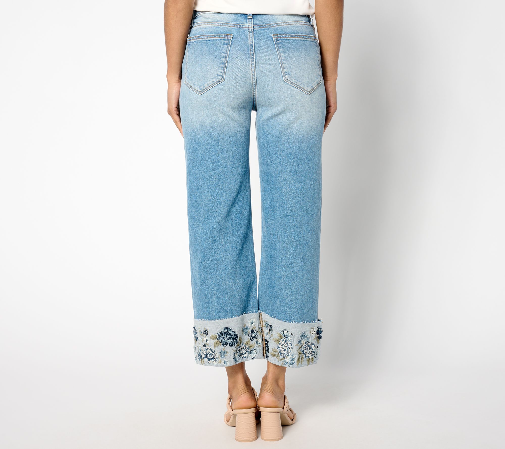Features: five-pocket styling, cuff with raw edge hem and embroidery at leg bottom opening, crop length