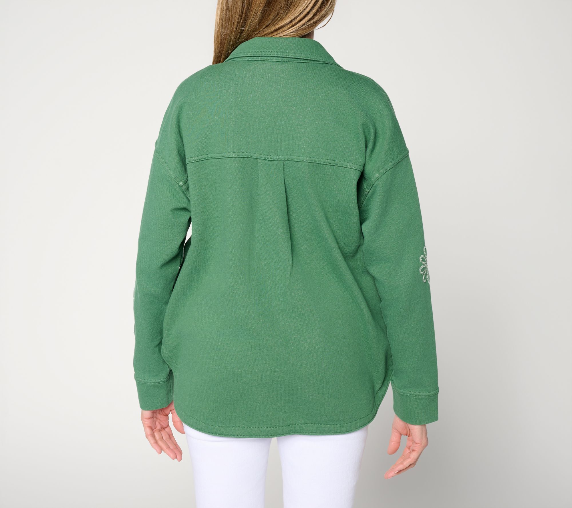 A day for layers (again)? Shake things up with this inspired shacket, displaying charming daisy patchwork. Crafted in impossibly cozy, movement-friendly Cloud French Terry -- the kind you can walk the dog, chase the kids, or curl up in -- the relaxed style is just as delightful worn as a shirt or slipped on over tees and tanks. And it's the perfect piece for social gatherings when you want to look casually chic (without trying too hard). From Driftwood Jeans.