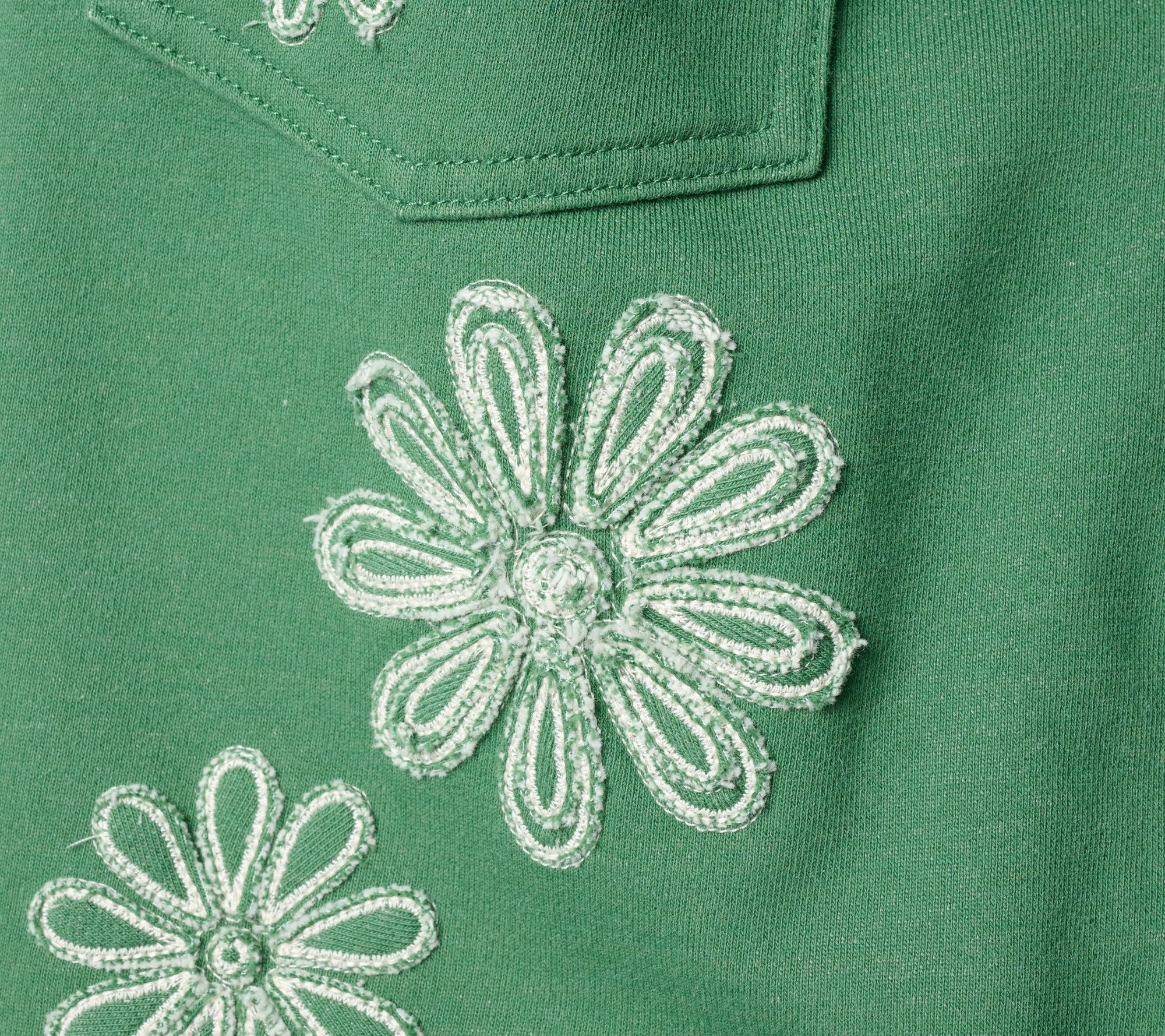Features: daisy patchwork embroidery, long sleeves, cuffs details, two chest pockets, finished hem