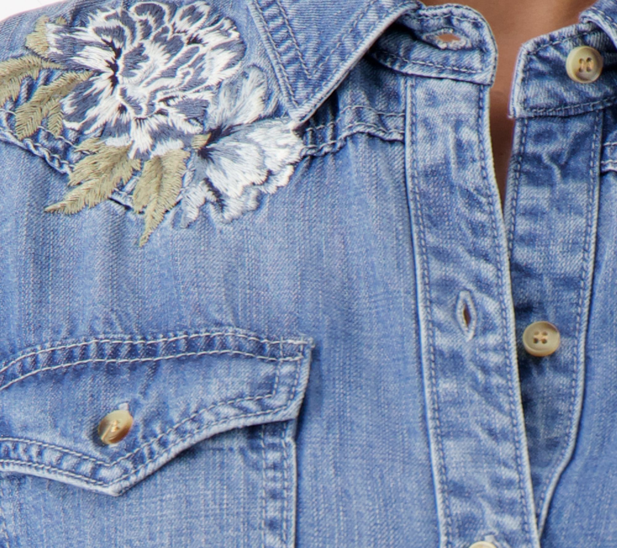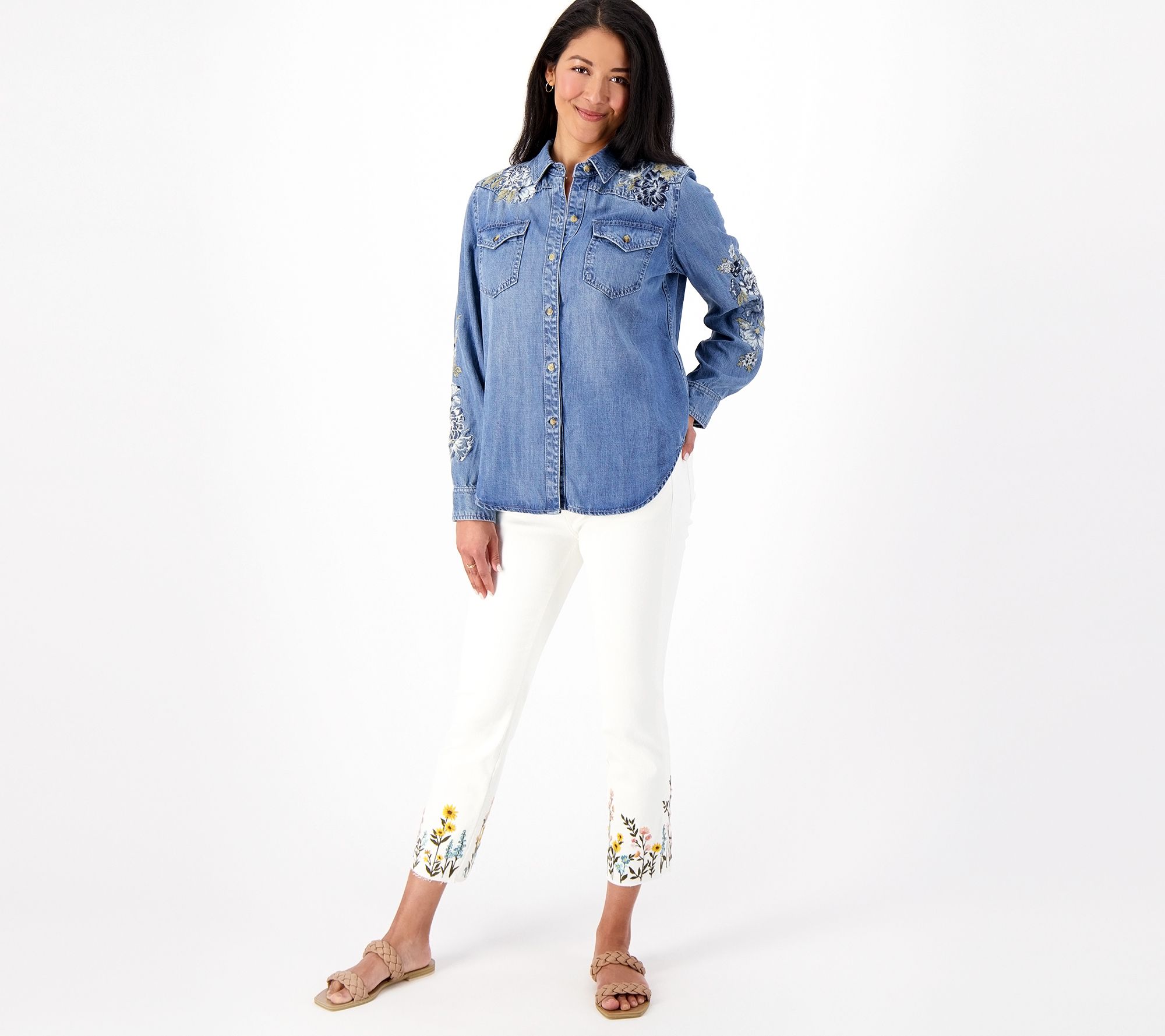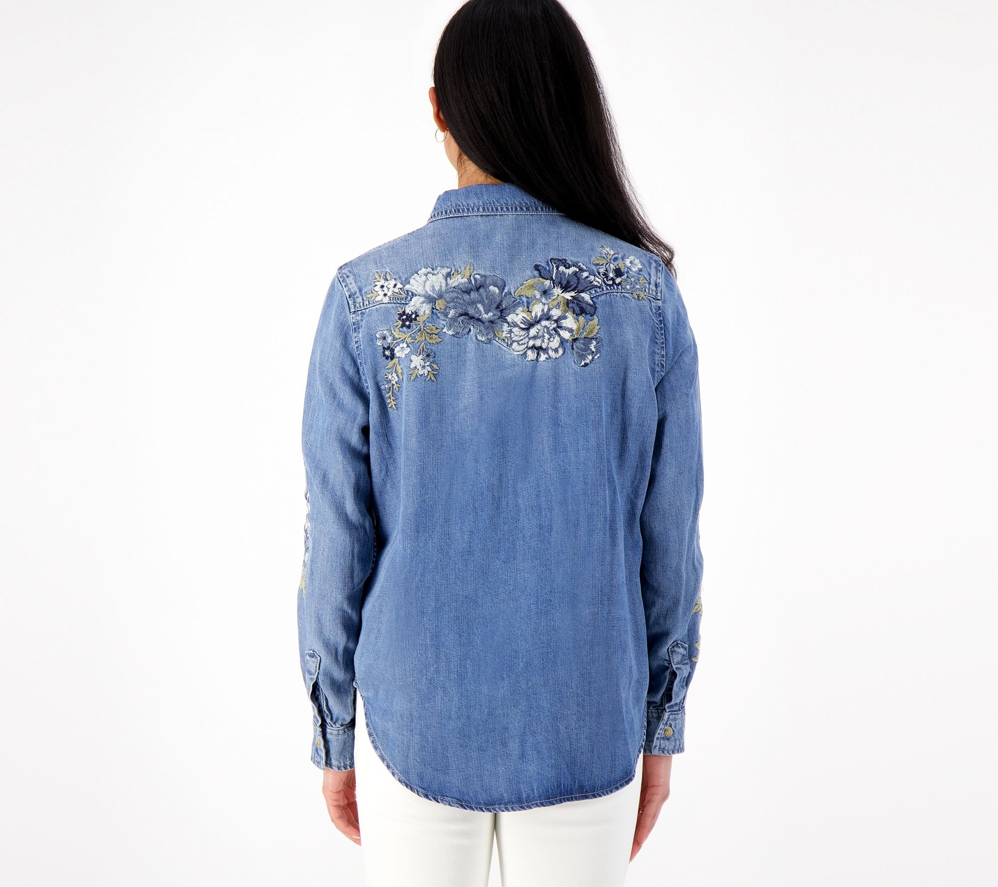 "As Is" Driftwood Jeans Embroidered Denim Button Front Shirt