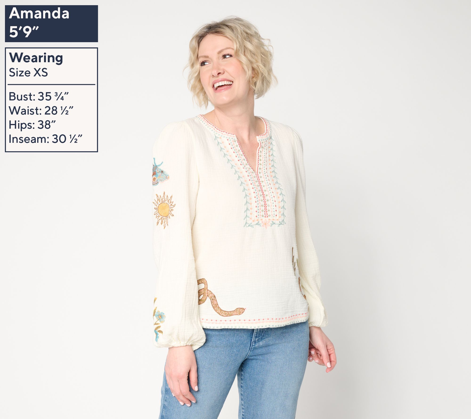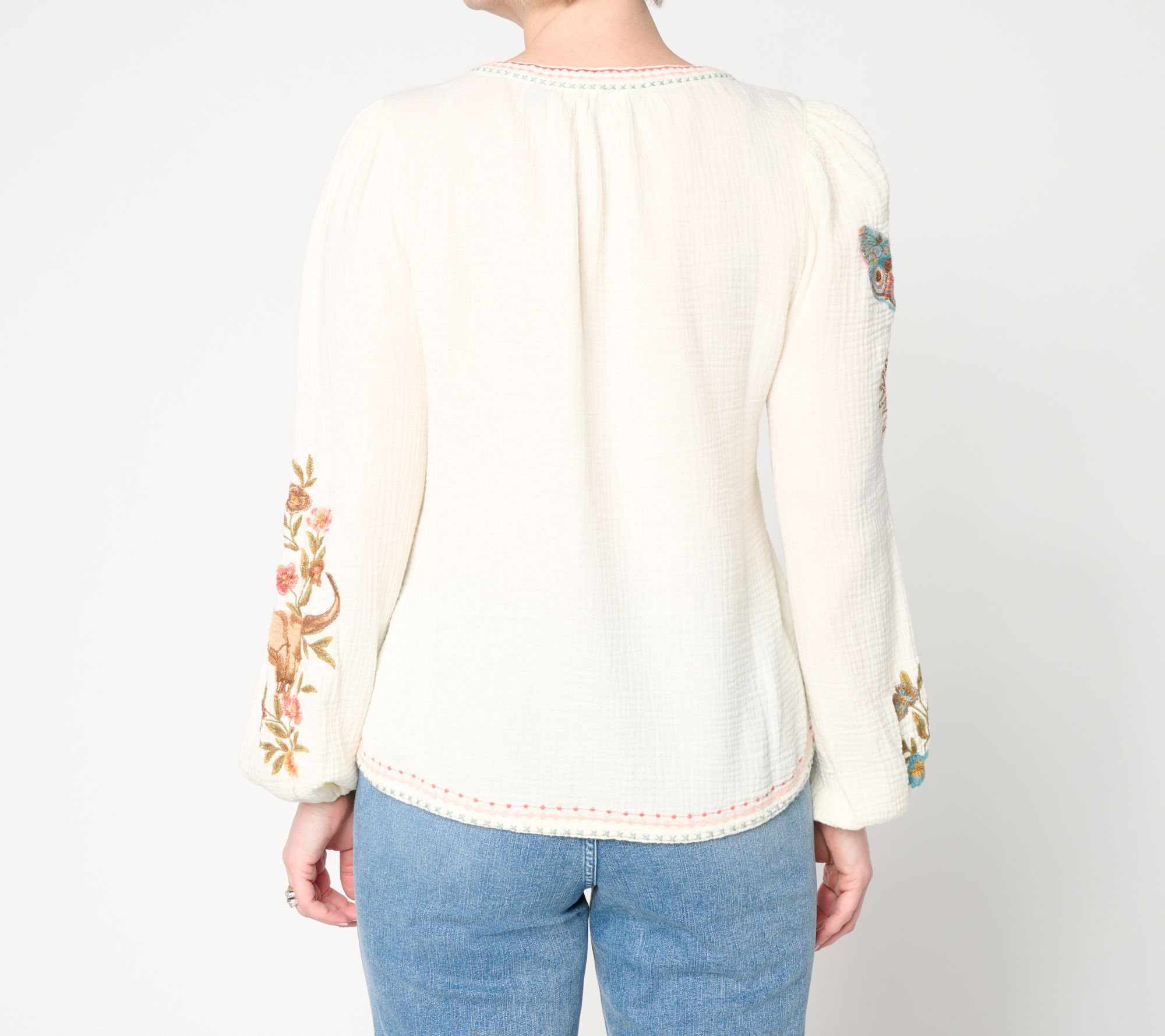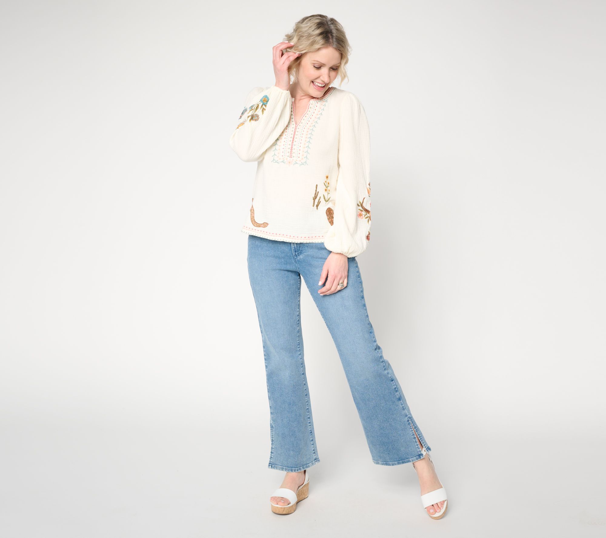 Lightweight comfort meets standout style when you toss on this knit boho embroidered top -- whether you're meeting friends for coffee or heading to a casual evening outing. Beautiful embroidery at the center front elevates the look, while easy elastic sleeve openings and a relaxed silhouette offer a laid-back vibe you'll love all season long. From Driftwood Jeans.