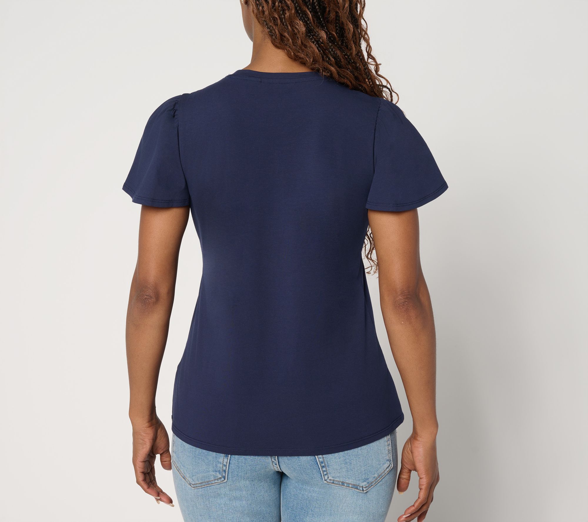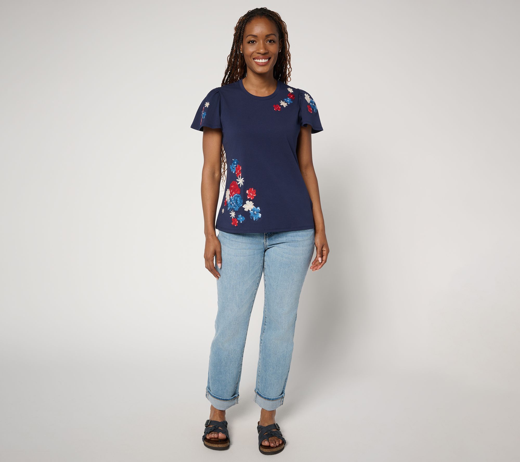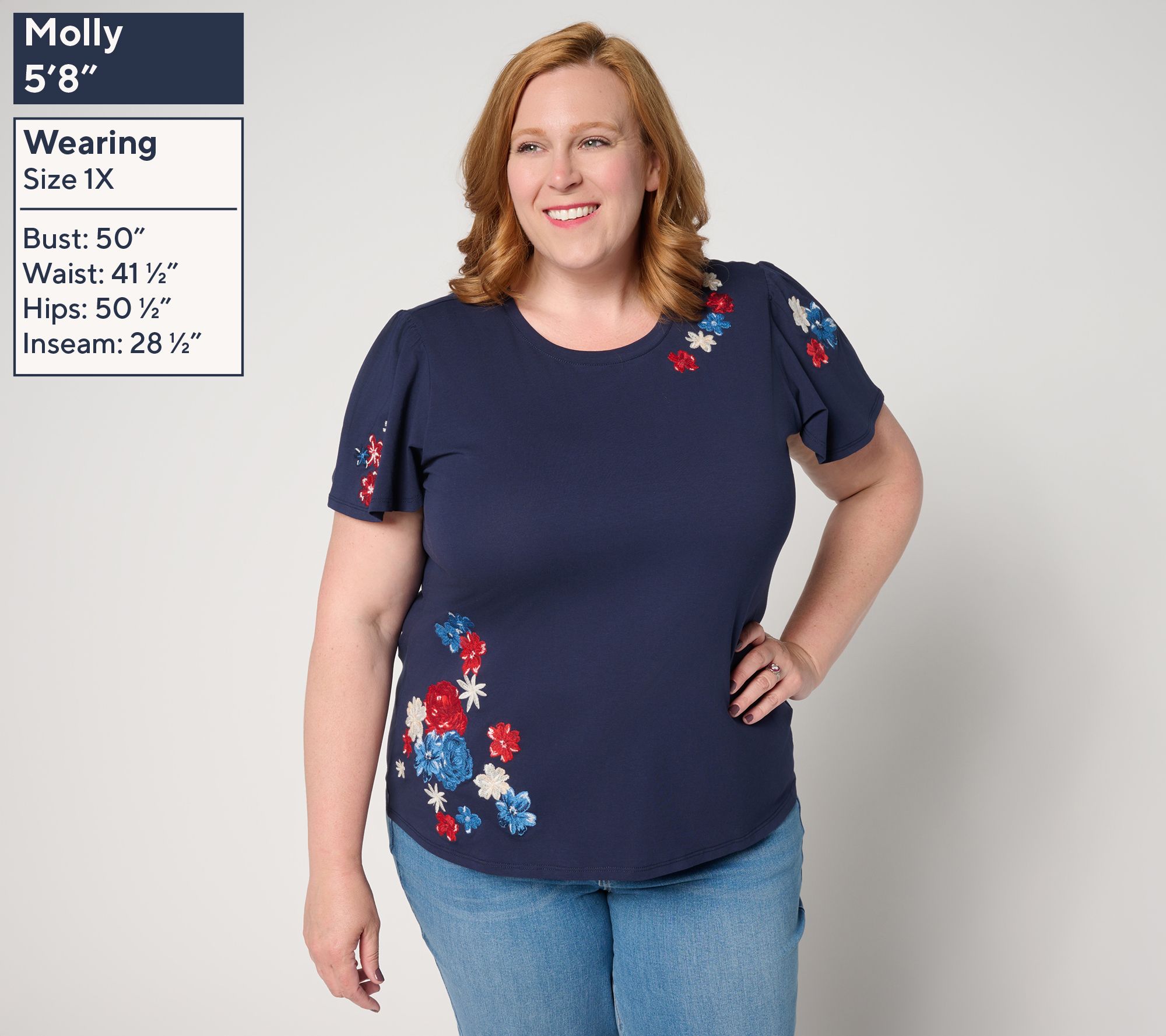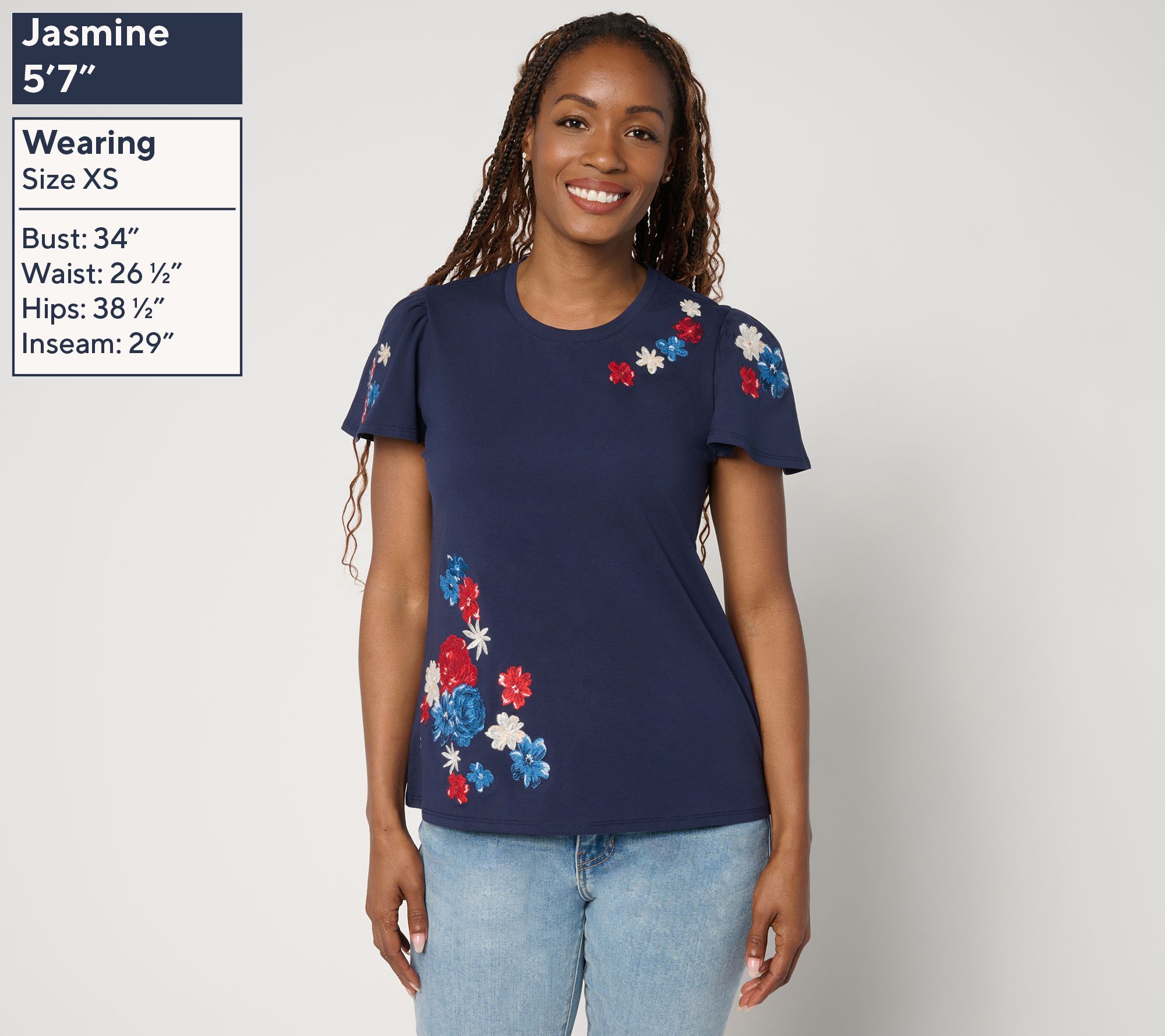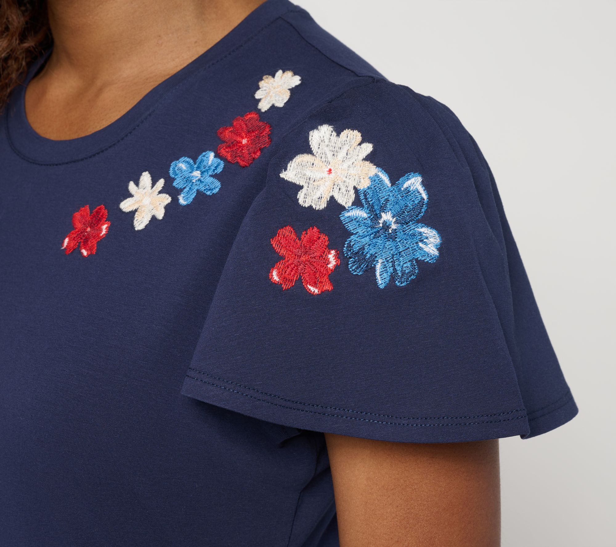 • Features: crewneck, short flutter sleeves, embroidered floral design on front and sleeves