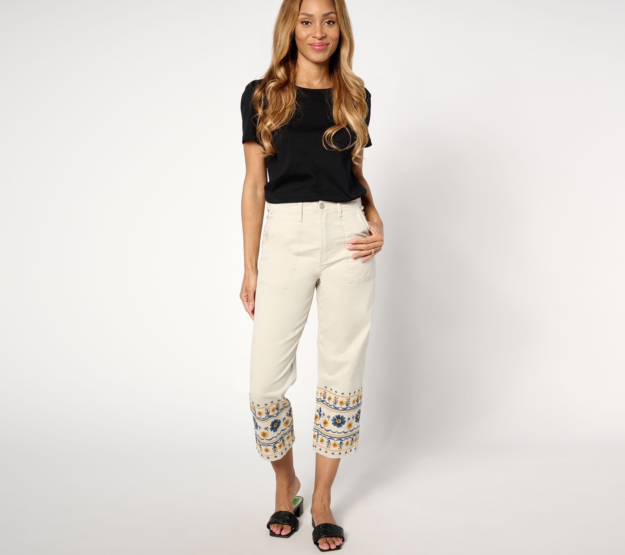 Stitch a statement look together with these relaxed-fit boyfriend crops. Fun floral embroidery customizes these utility-style pants with your own brand of personal flair. From Driftwood Jeans.