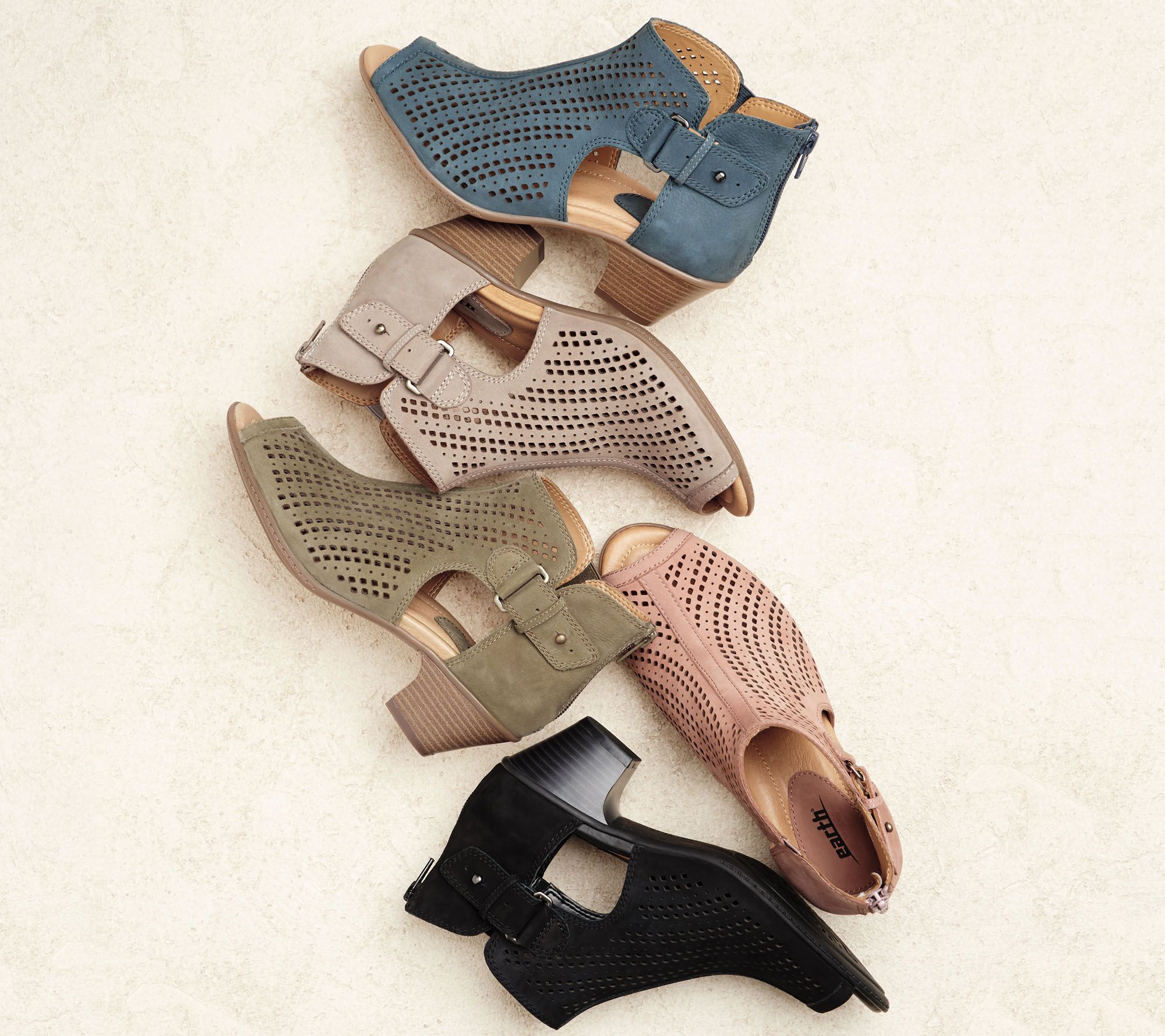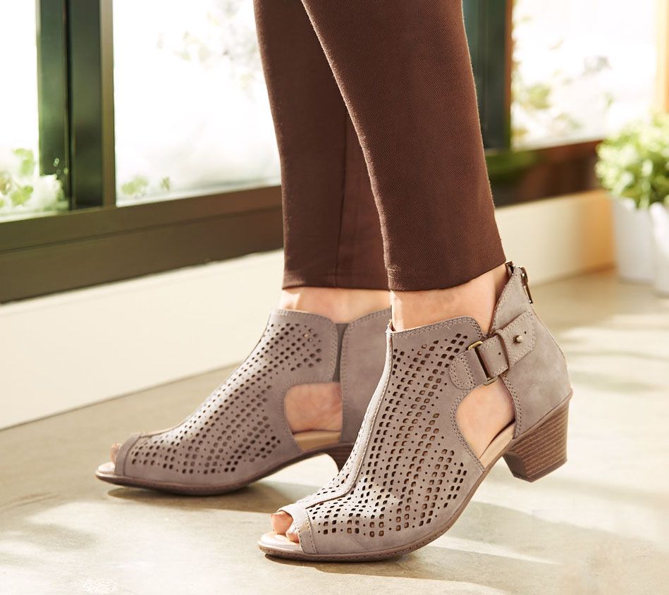 Treat your feet to a trend-right style that transcends seasons. Earth's beautifully crafted leather booties are your go-to shoe if you crave both the confident coverage of a boot and the freeing feel of a sandal. The ankle-high design and padded interior keep you comfortably on your toes, while laser-cut details, side cutouts, and a flirty peep-toe show off your feminine side. This chic look wears just as well with jeans and a jacket as it does with spring's latest go-with-the-flow fashions. From Earth Brands Footwear.