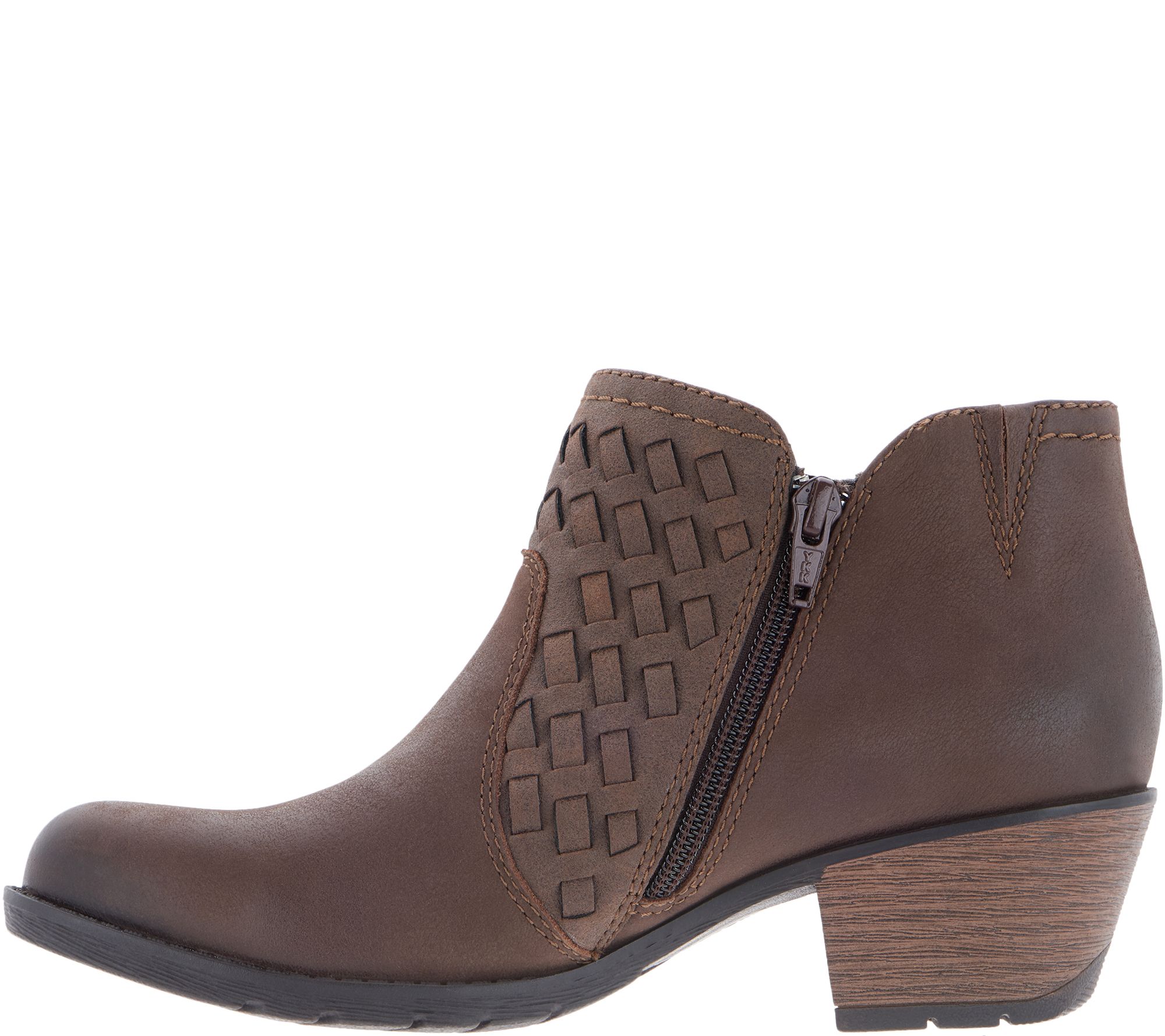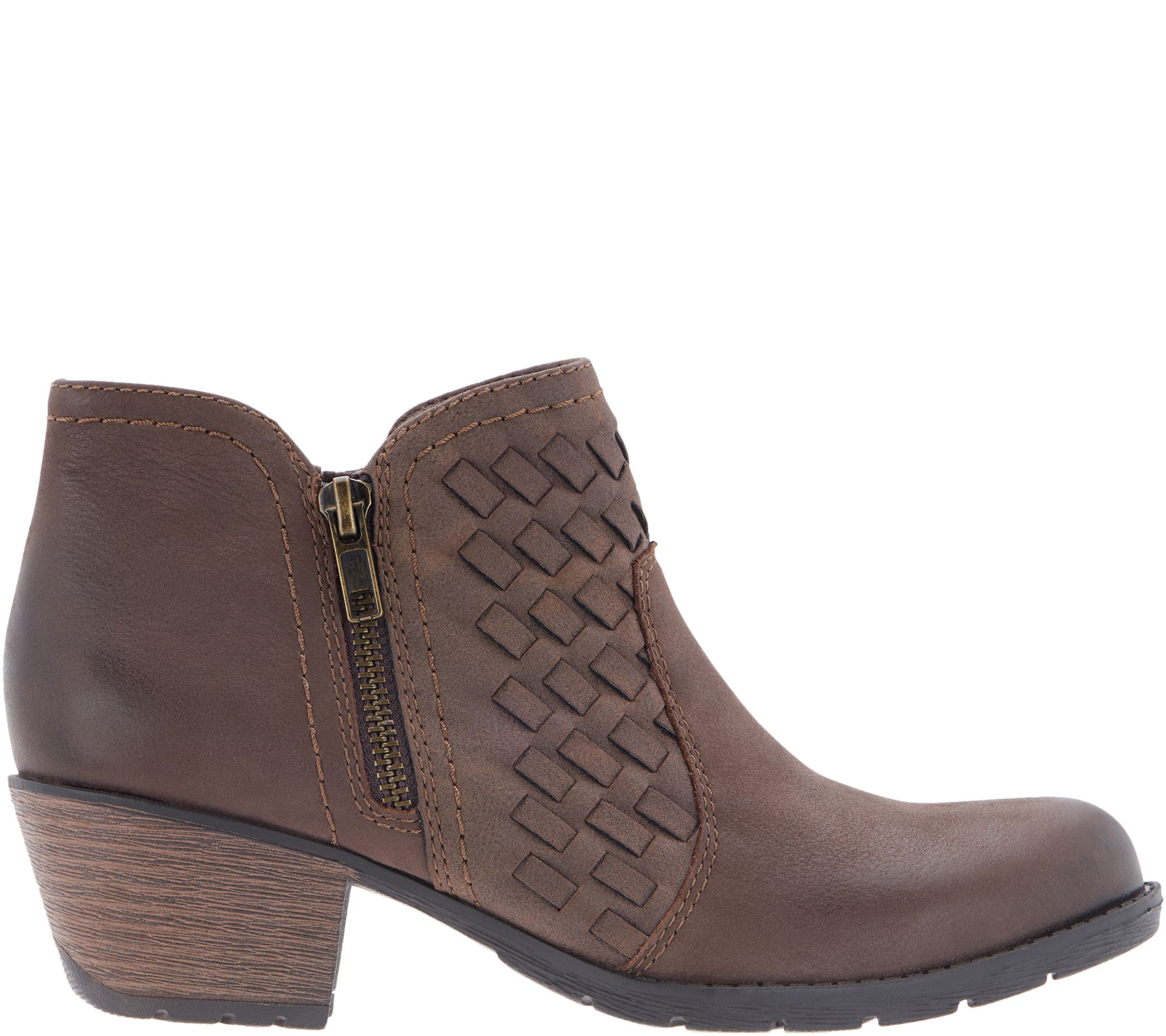 A woven design elevates these leather booties for that dash of texture any outfit could use. From Earth Brands Footwear.