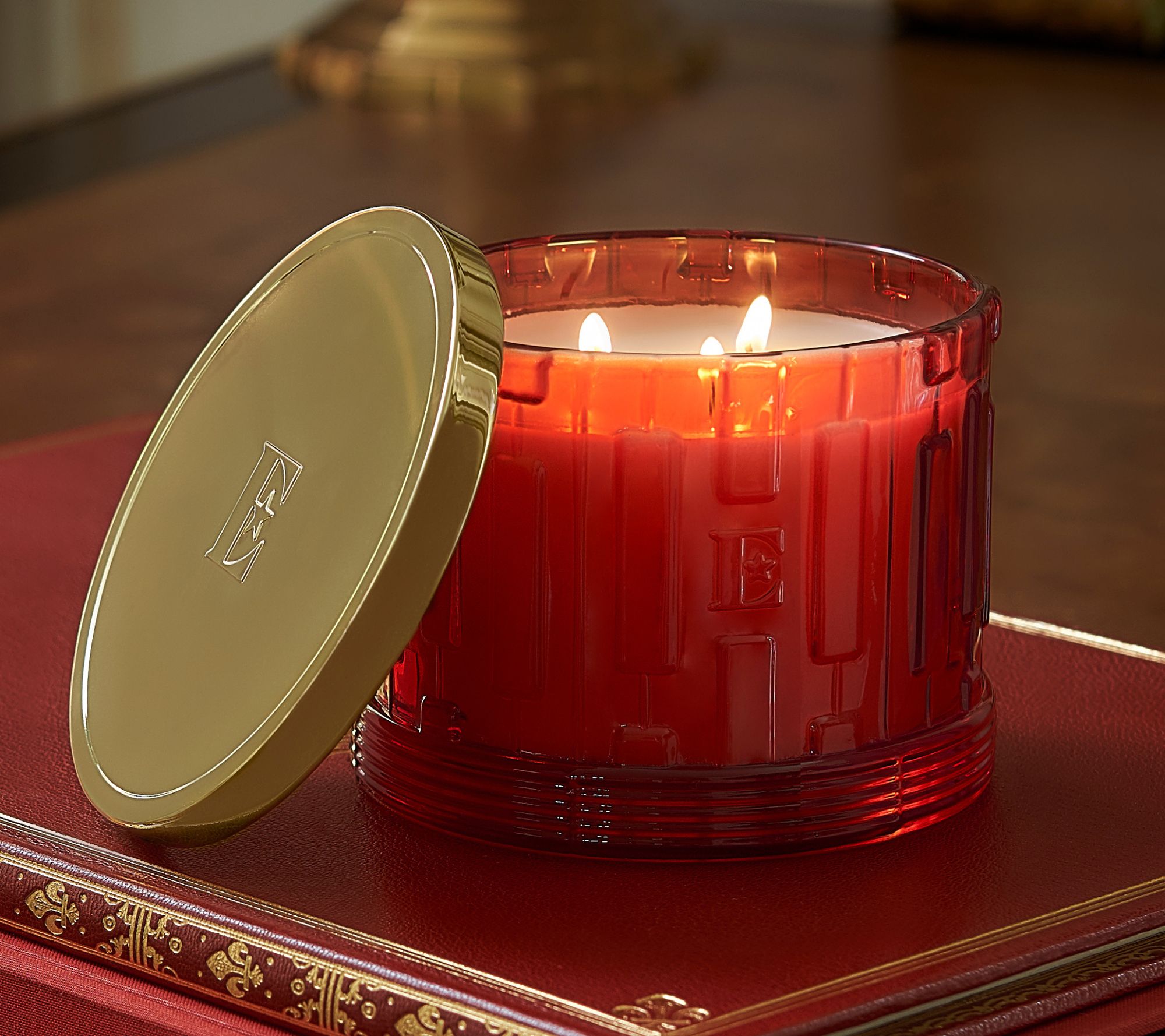 Memories of holidays past blend seamlessly with moments yet to come in these captivating fragrances. The elegant three-wick candles make a striking statement in their piano-key embossed vessels, while the warm glow dances through the colored glass. The sophisticated vessels are crowned with goldtone lids, each graced with an iconic star emblem -- a signature touch that completes their luxe appeal.