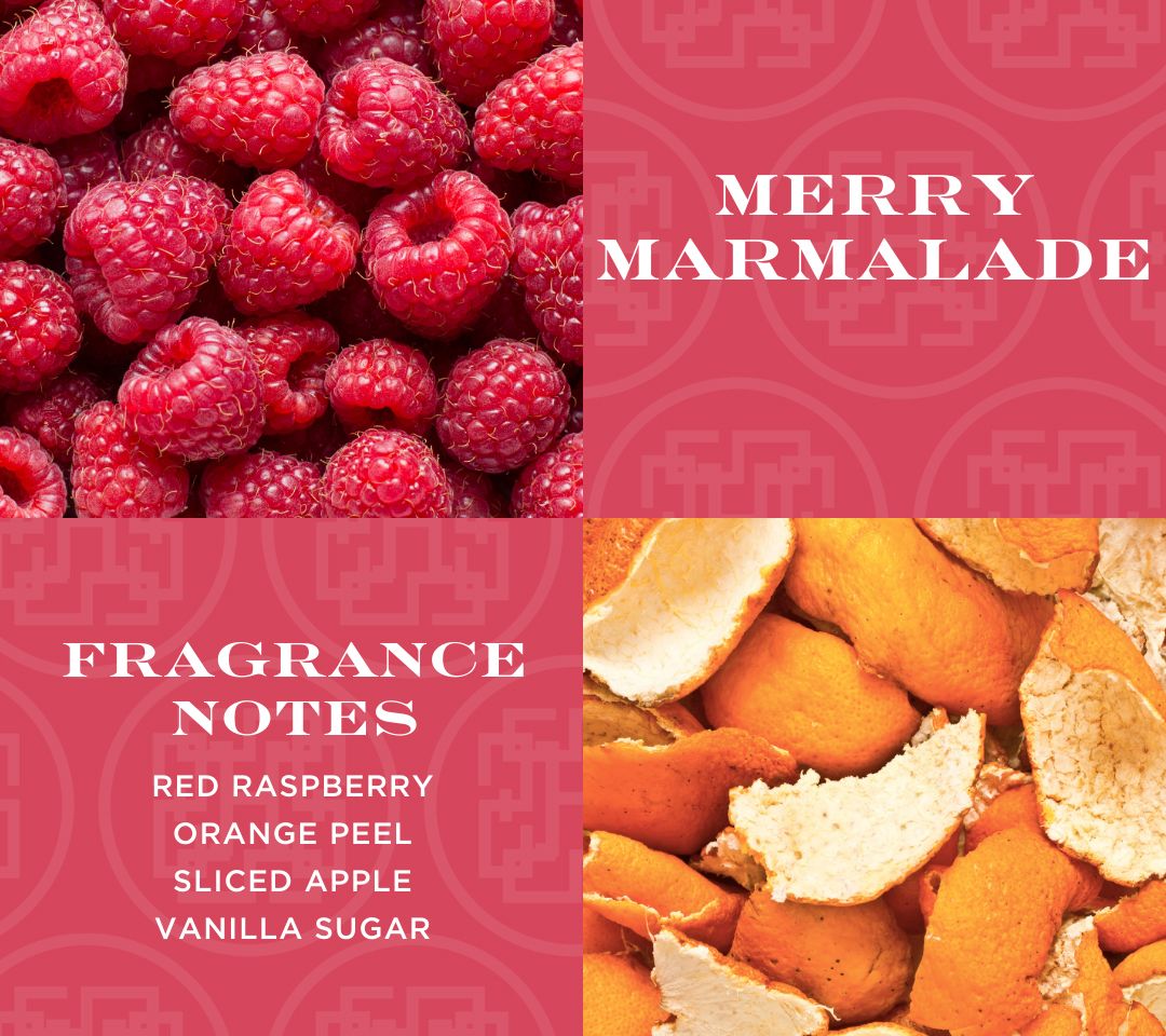 • Includes two 14-oz Merry Marmalade-scented candles and romance card