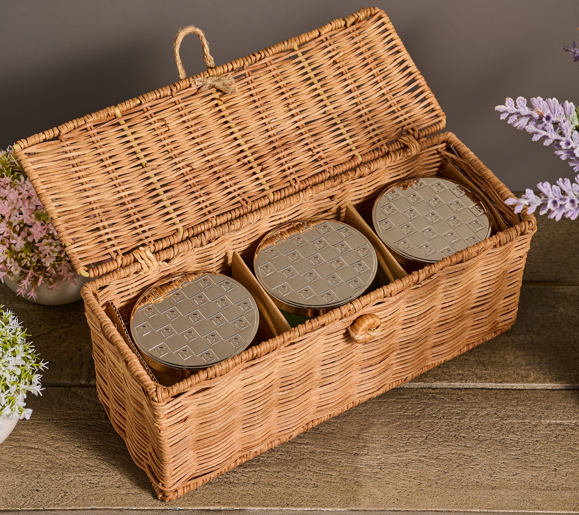 • Includes three 8-oz one-wick candles in a wicker hamper: one candle each in Apple Mint Tea, Rhubarb Strawberry Crumble, and Sugared Pear and Vanilla