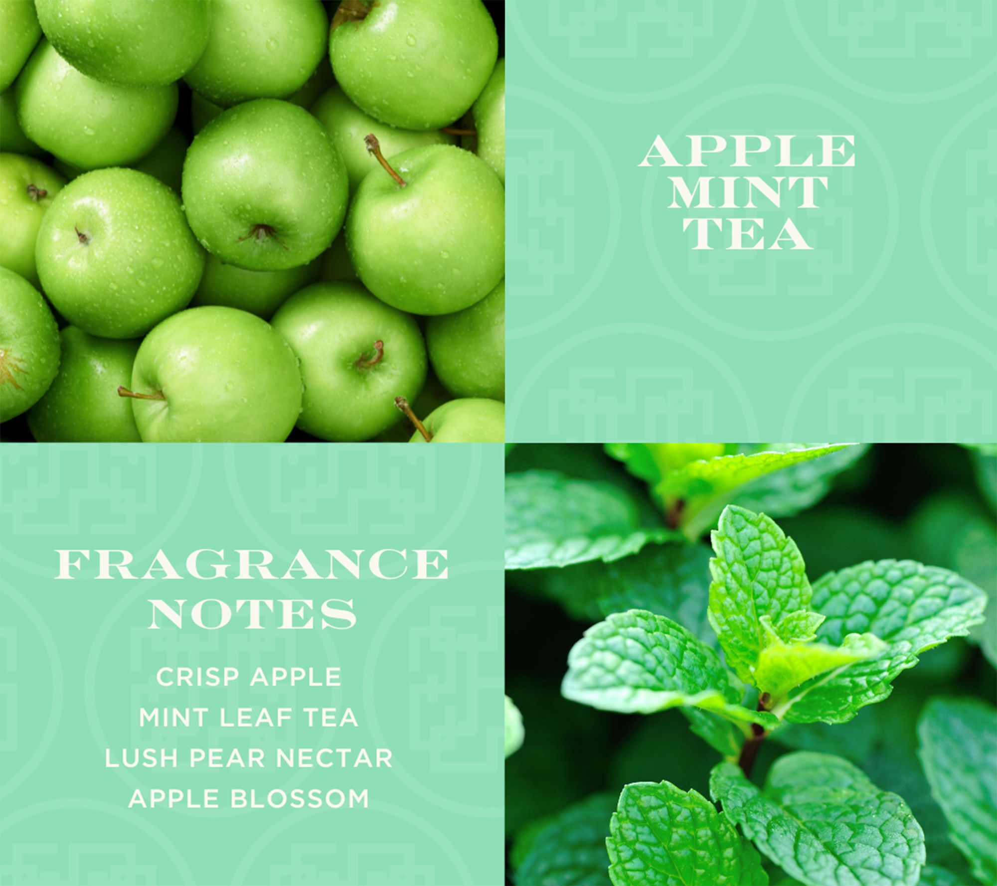 • Apple Mint Tea (mint green): a blend of crisp apple, mint leaf tea, lush pear nectar, and apple blossom