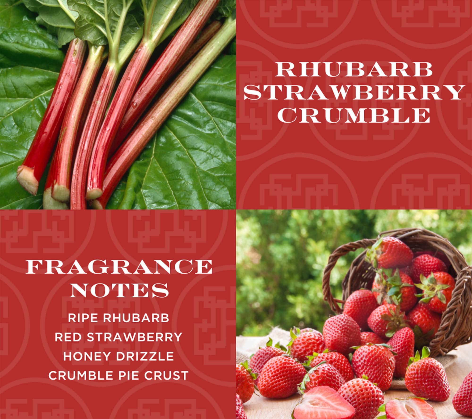 • Rhubarb Strawberry Crumble (dark pink): a blend of ripe rhubarb, red strawberry, honey drizzle, and crumble pie crust