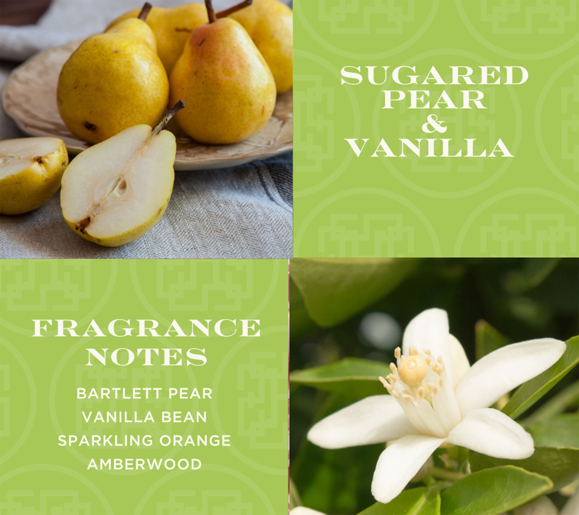 • Sugared Pear and Vanilla (yellow): a blend of Bartlett pear, vanilla bean, sparkling orange, and amber wood