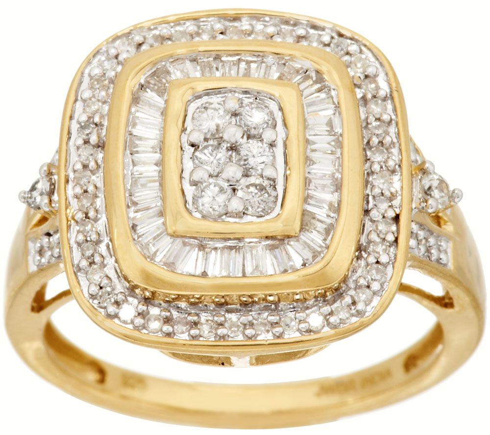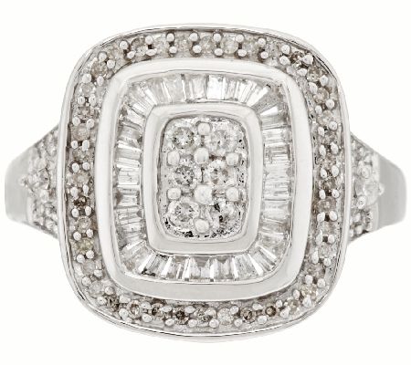 • Emerald-shaped ring with center cluster of round, pave-set diamonds; halo of channel-set baguettes and outer halo of bead-set, round diamonds; slightly split shank with bead-set, round diamonds and single, raised prong-set, round diamond in between; white rhodium accents diamond settings; highly polished finish; openwork gallery
