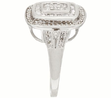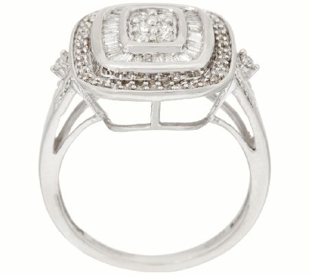 Hey there, halo! Greet each day in this sterling silver Affinity ring, with a design of two sunshiny, diamond halos. At the emerald-shaped center, a cluster of round, pave-set diamonds delivers eye-opening dazzle, while prong-set diamonds peek out from the sides of the split shank. From Affinity(R) Diamond Jewelry.