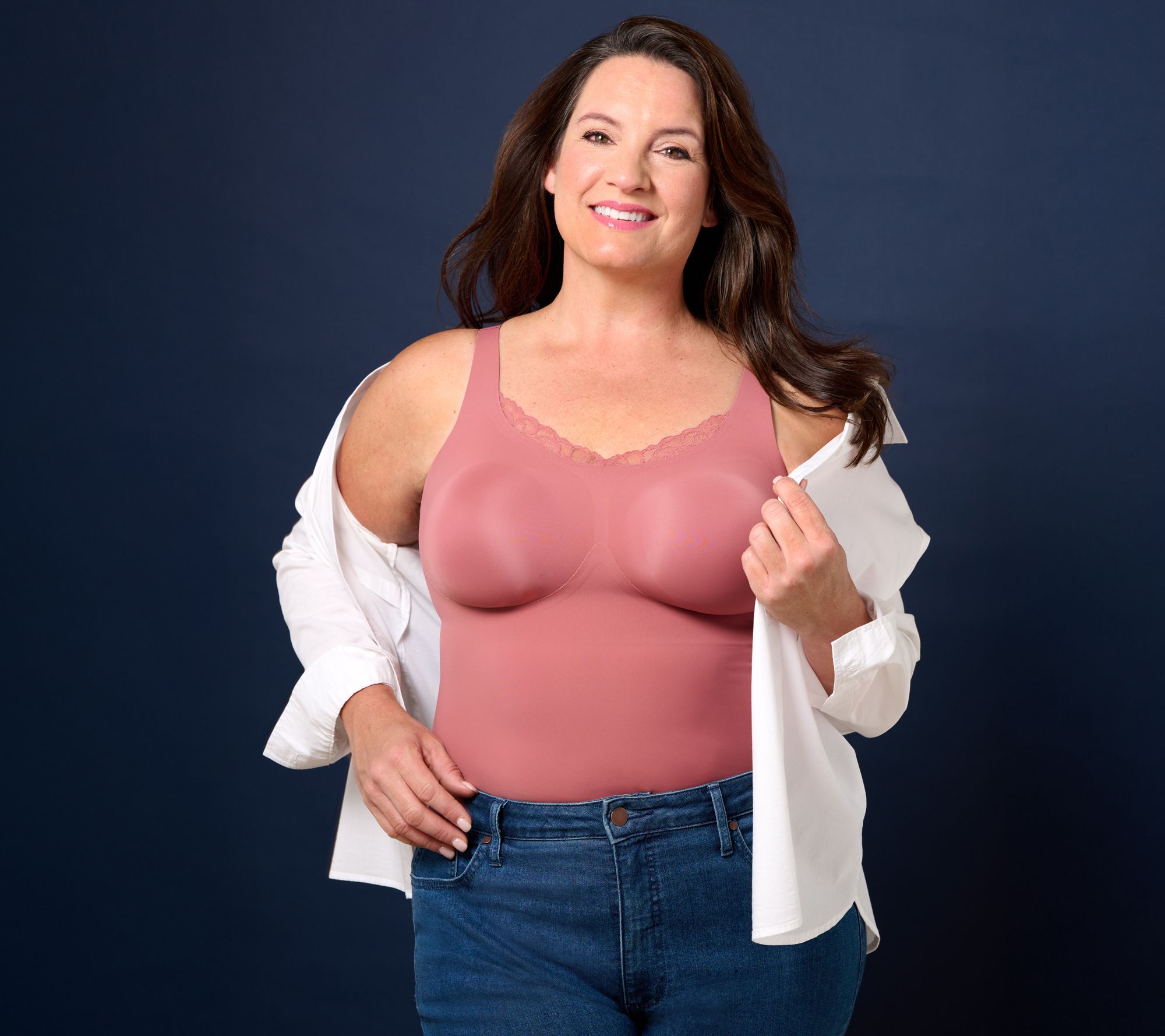 While it's a figure flatterer underneath your clothes, it also gives you more ways to style your outfits. This bra/cami loves to layer. Wear it under a sheer blouse, smart blazer, cropped top, or cardigan. Feeling feminine and flirty? Create the perfect peekaboo look with a low-cut top to reveal the lacy trim. Plus, those occasional gaps in button-down blouses feel less risque with this garment underneath.