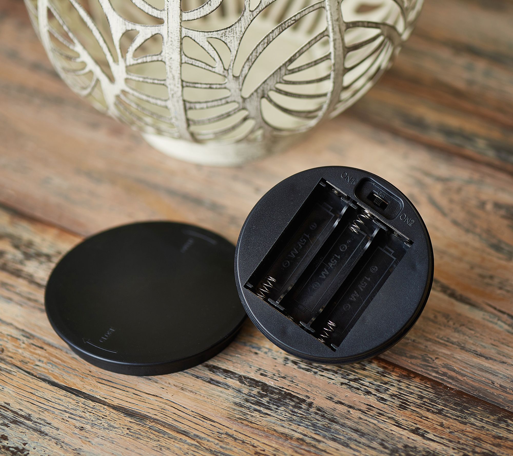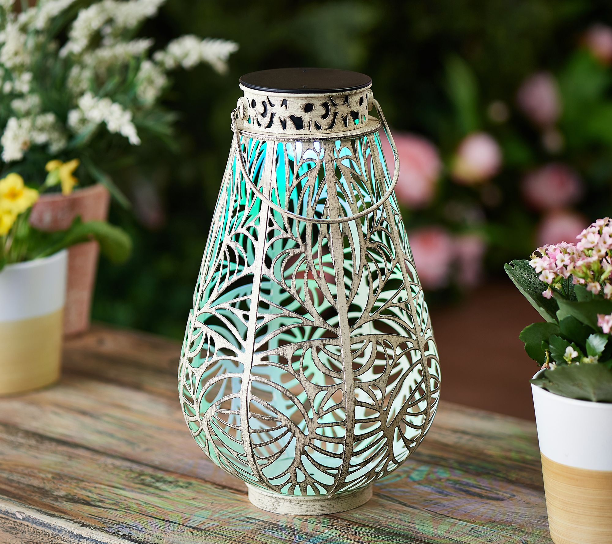 Shine a light on your indoor or outdoor decor with this decorative metal lantern. The unique rotating light creates a peaceful shimmer as it shines through the cutout pattern, revealing a warm white or color-changing illumination from within. From Garden Reflections.
