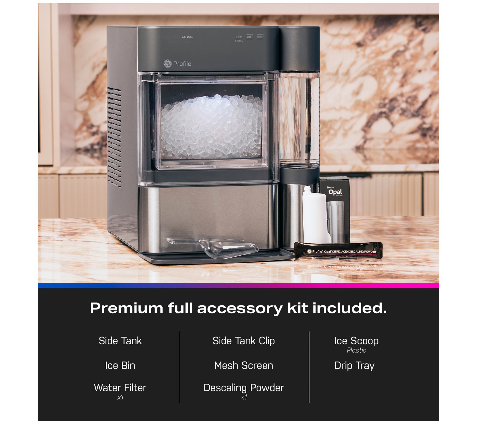 • Includes nugget ice maker with removable side tank, filters, and metal scoop
