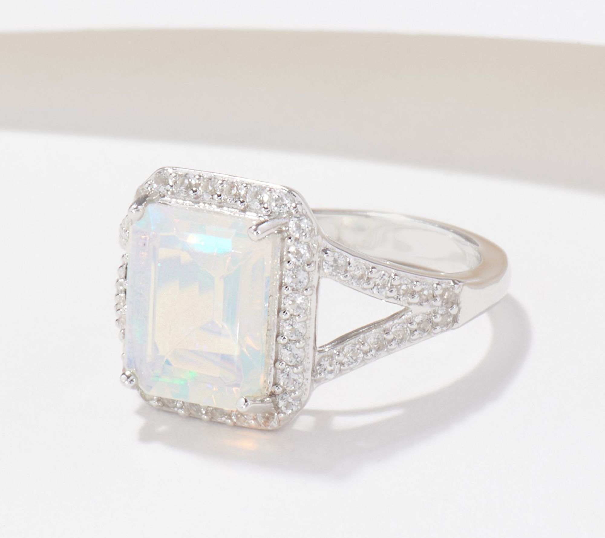 • Prong-set, emerald-cut gemstone; halo of prong-set, round white topaz gemstones that continue down split shank