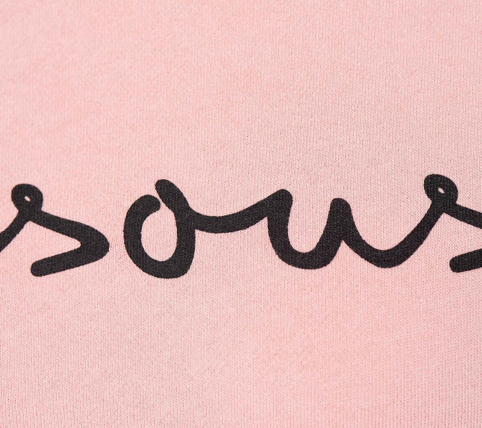 • Features: round neckline, dropped shoulder, screen print at front under neck, rib binding over back neck seam, long sleeves, rib cuffs, rib binding at bottom hemline