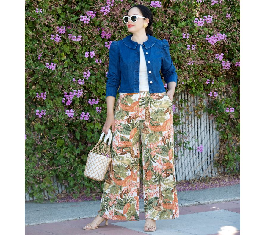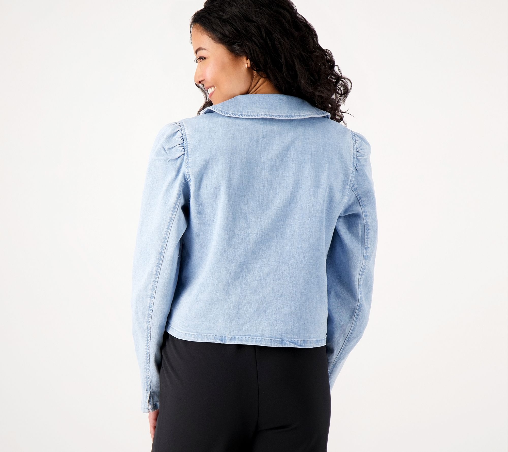 Girl With Curves, peter pan collar, denim jacket, long sleeves with sleeve slit at back sleeve seam, button closure at front, bust darts.