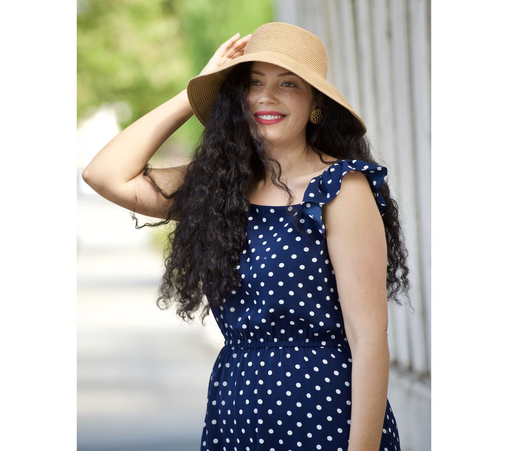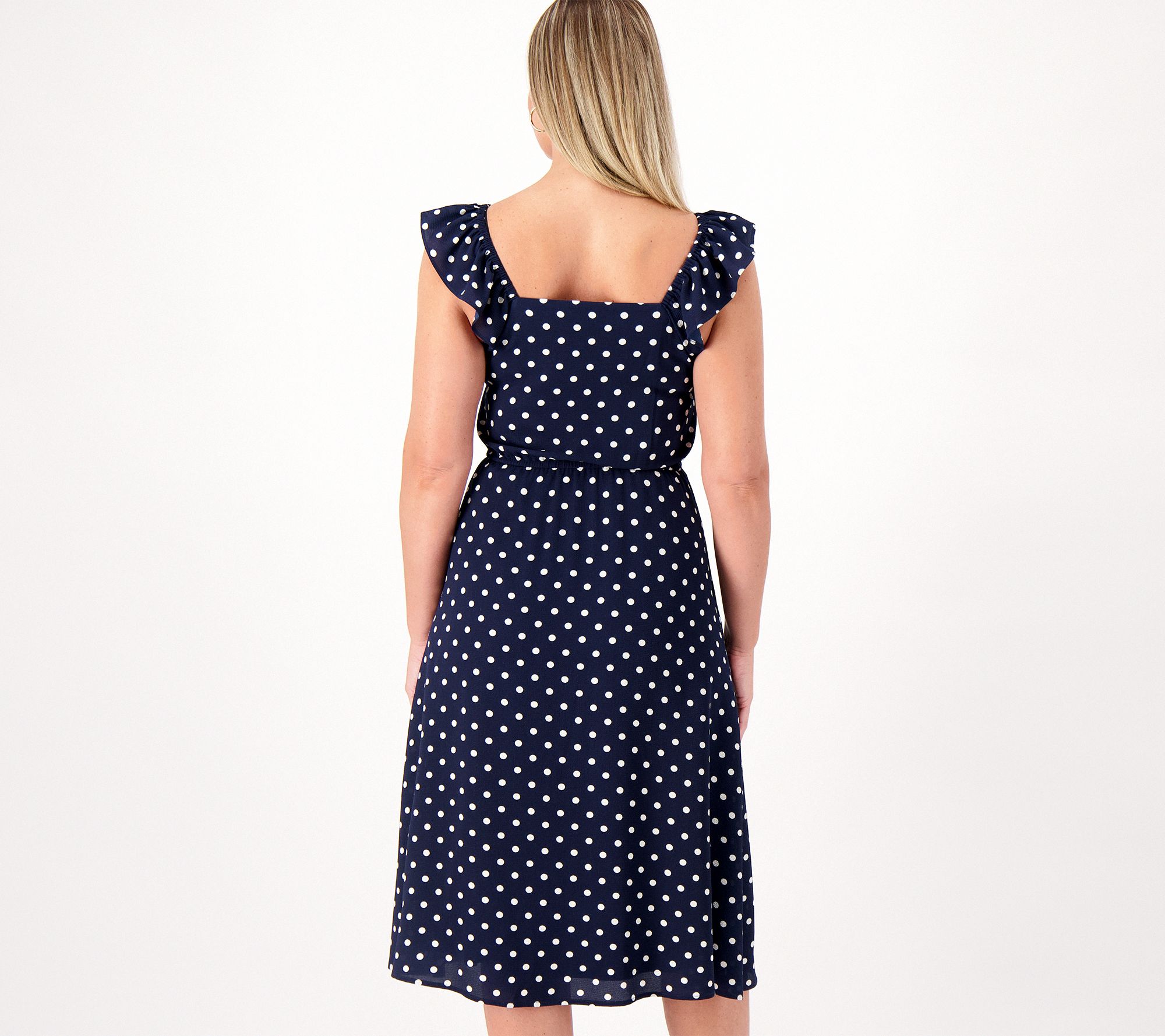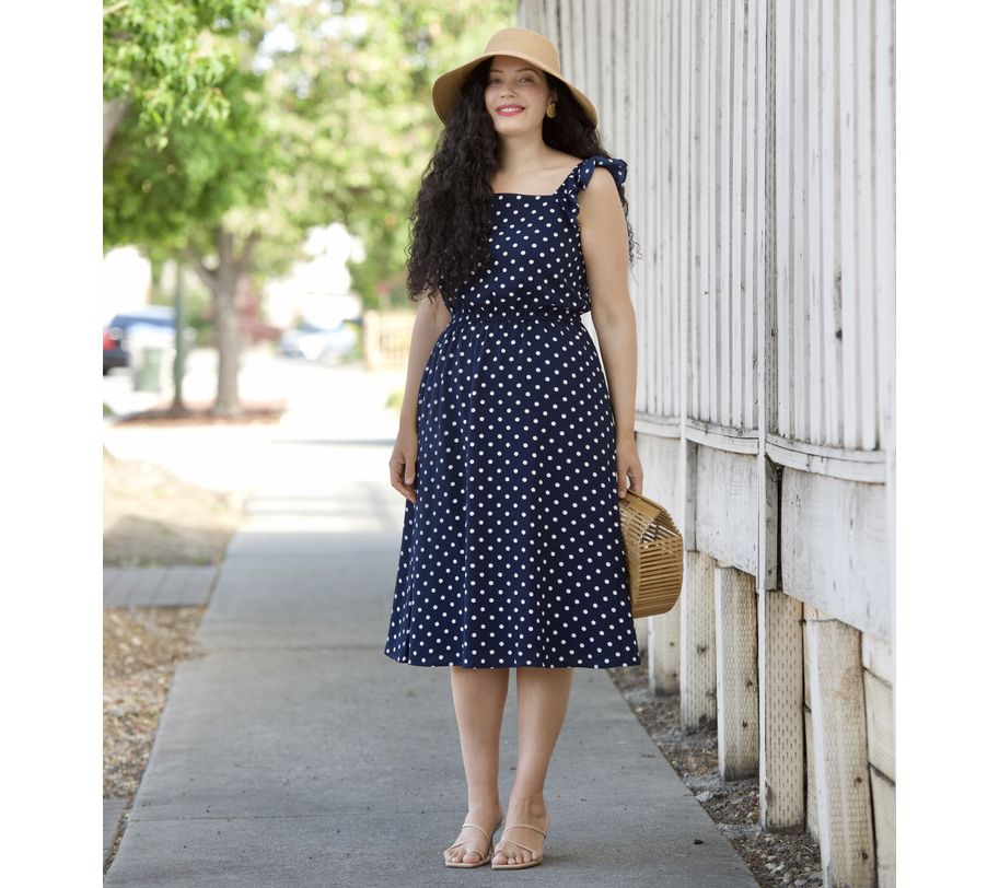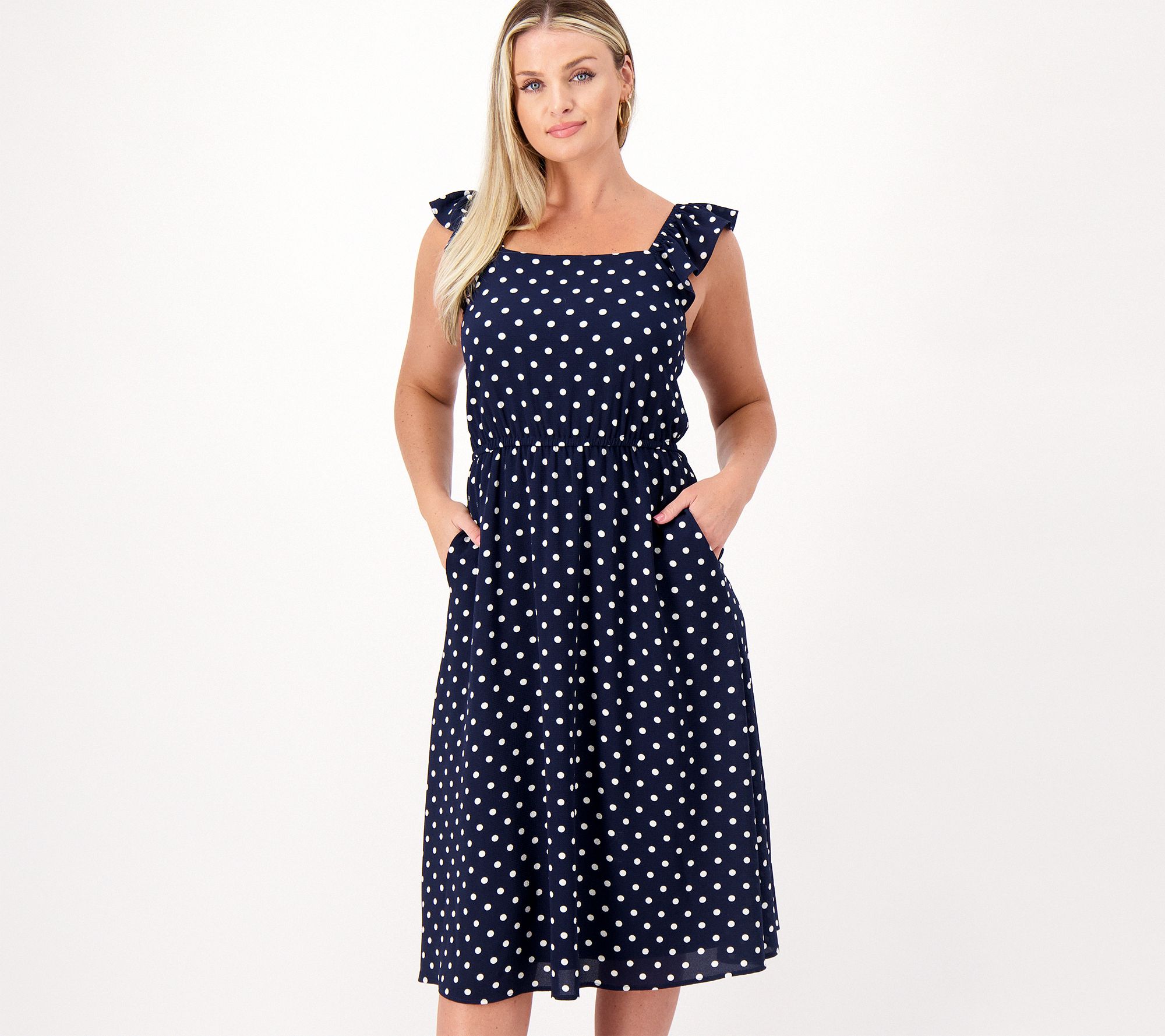 • Features: square neck, midi dress, ruffle at shoulders, tunneled elastic waist, side-seam pockets, lined body and skirt