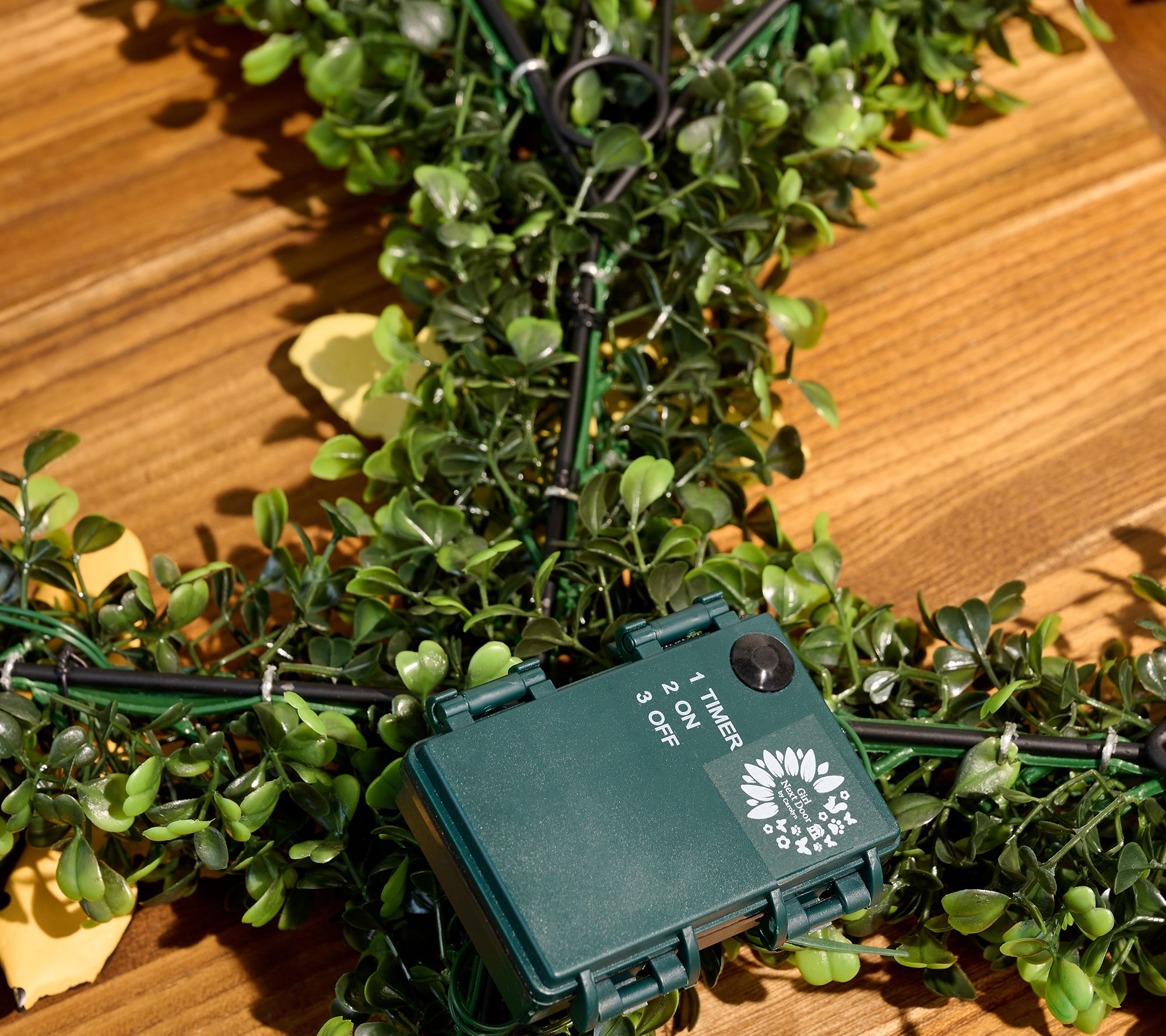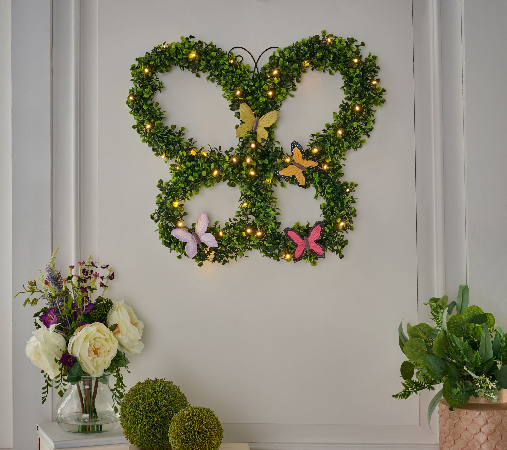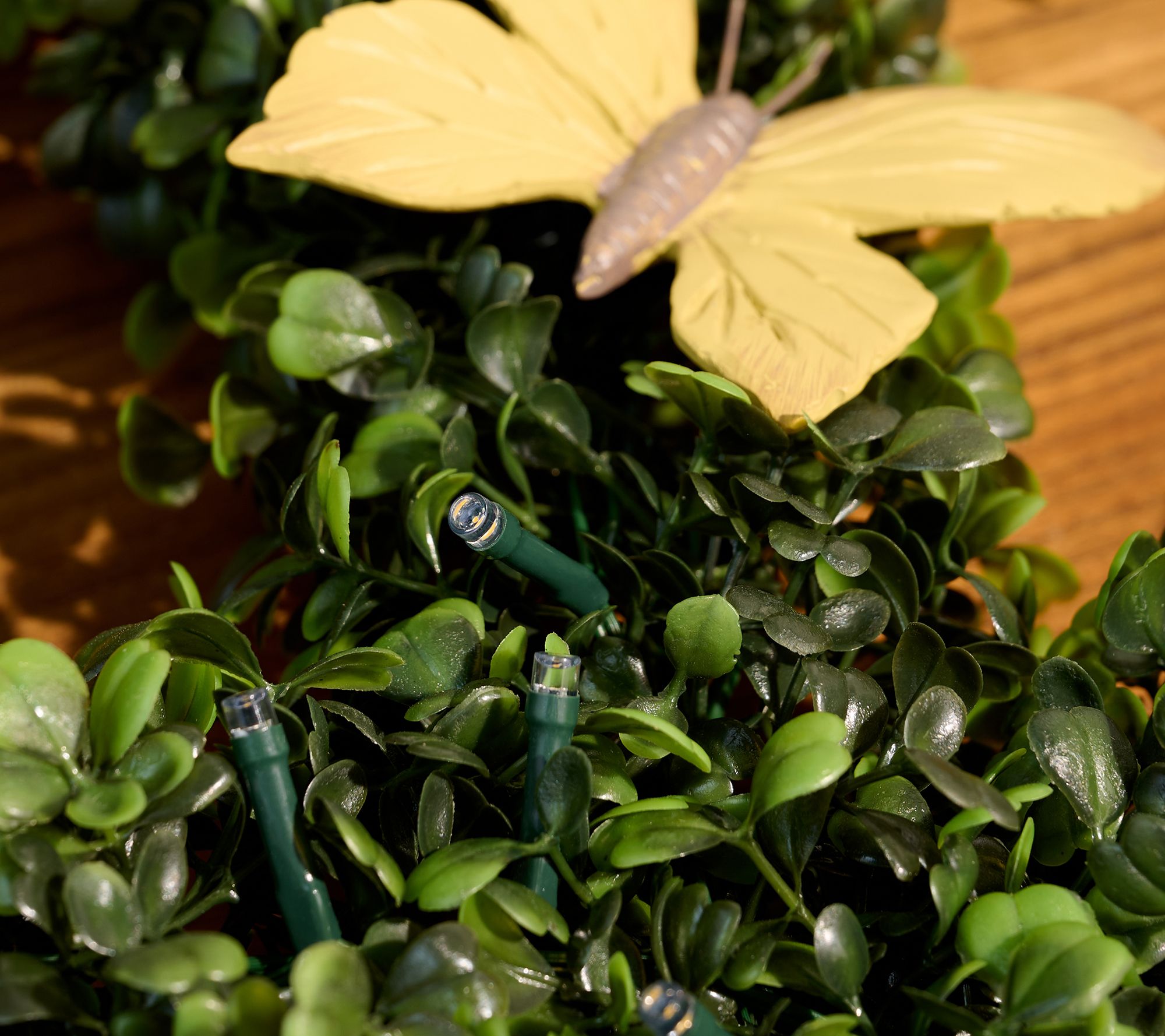 Welcome guests with a touch of lifelike greenery. Crafted in a whimsical shape, this boxwood wreath brings endless joy by day and illumination by night. From Girl Next Door.